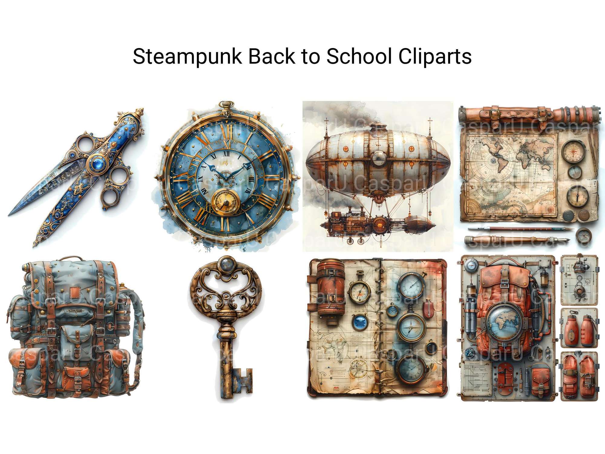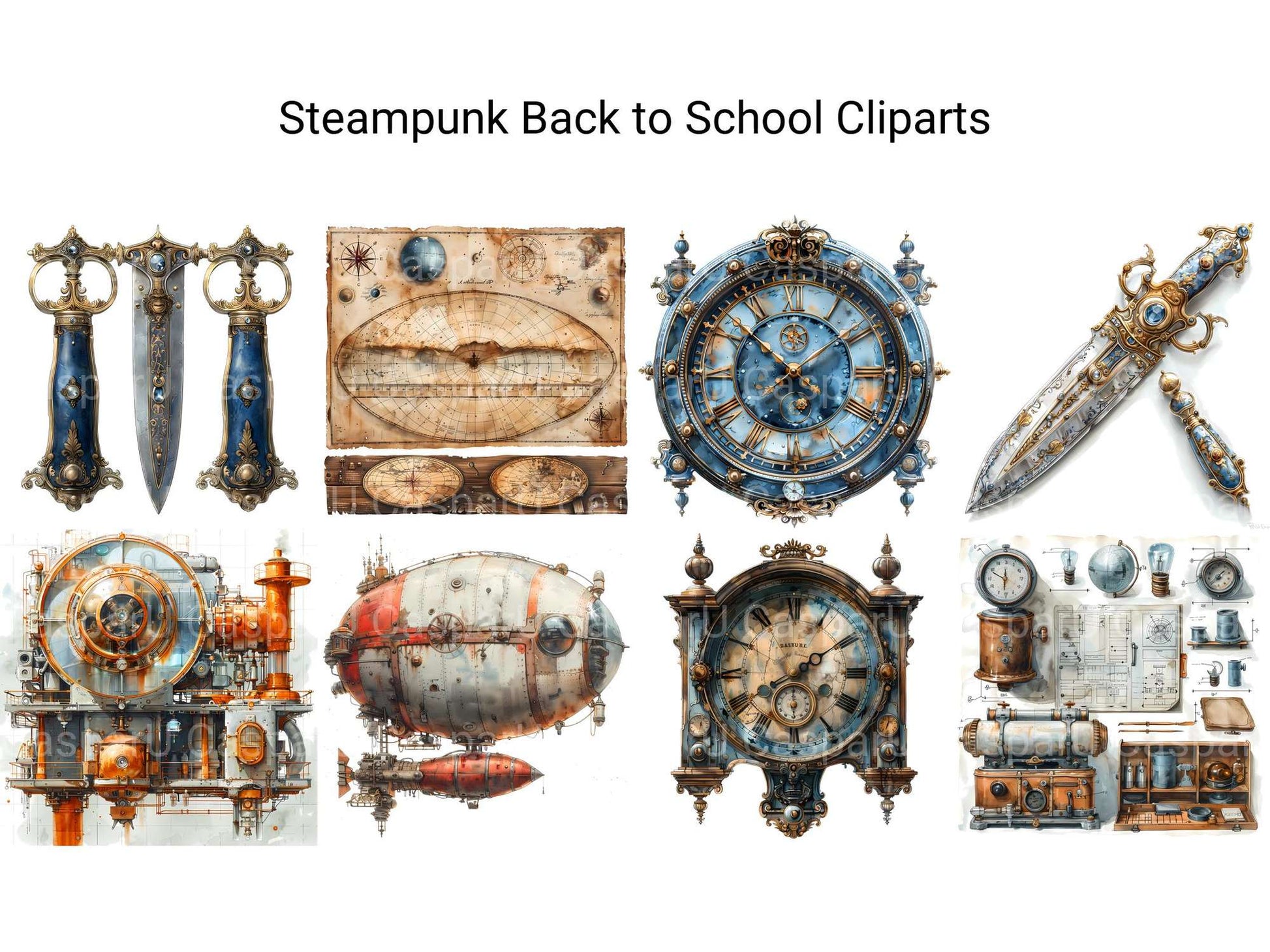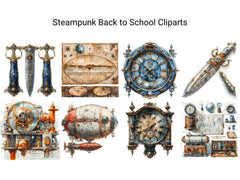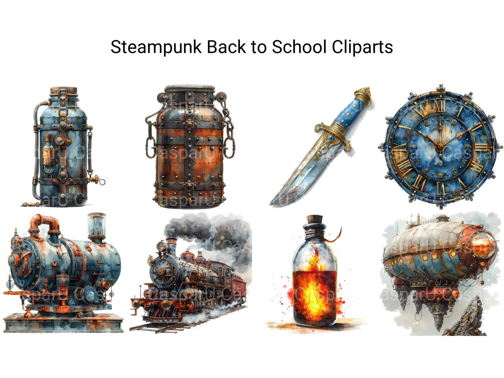 Step into a world where Victorian elegance meets futuristic imagination with steampunk-themed back-to-school cliparts. These illustrations blend gears, gadgets, and school supplies, perfect for a unique and creative design.