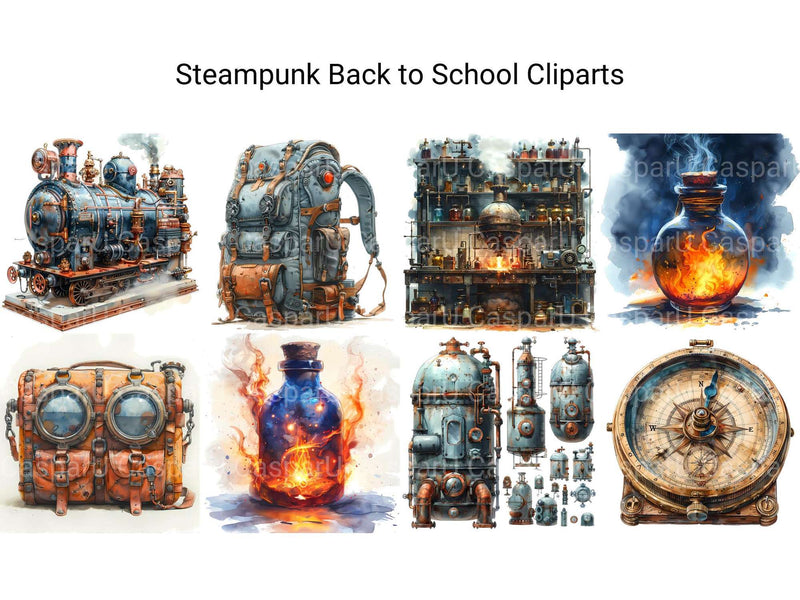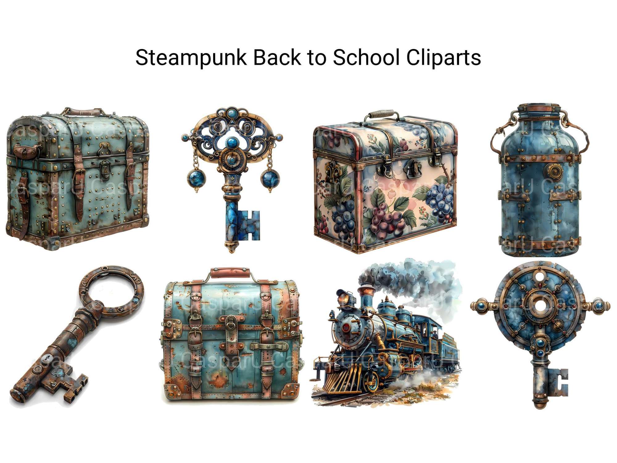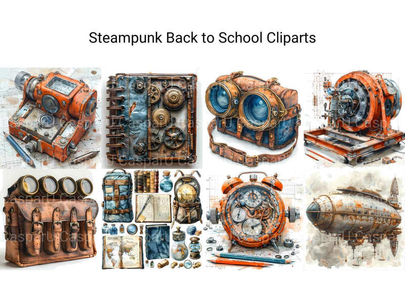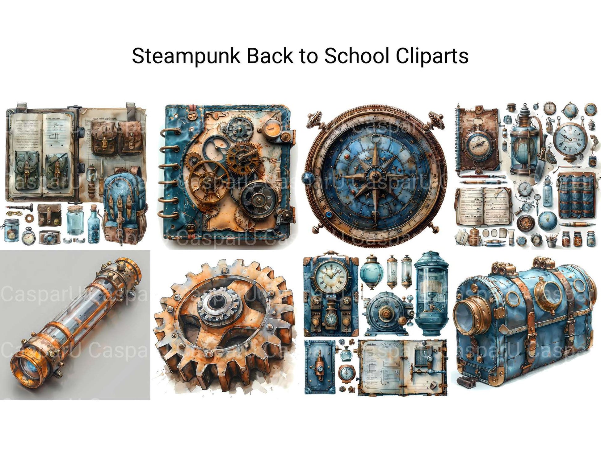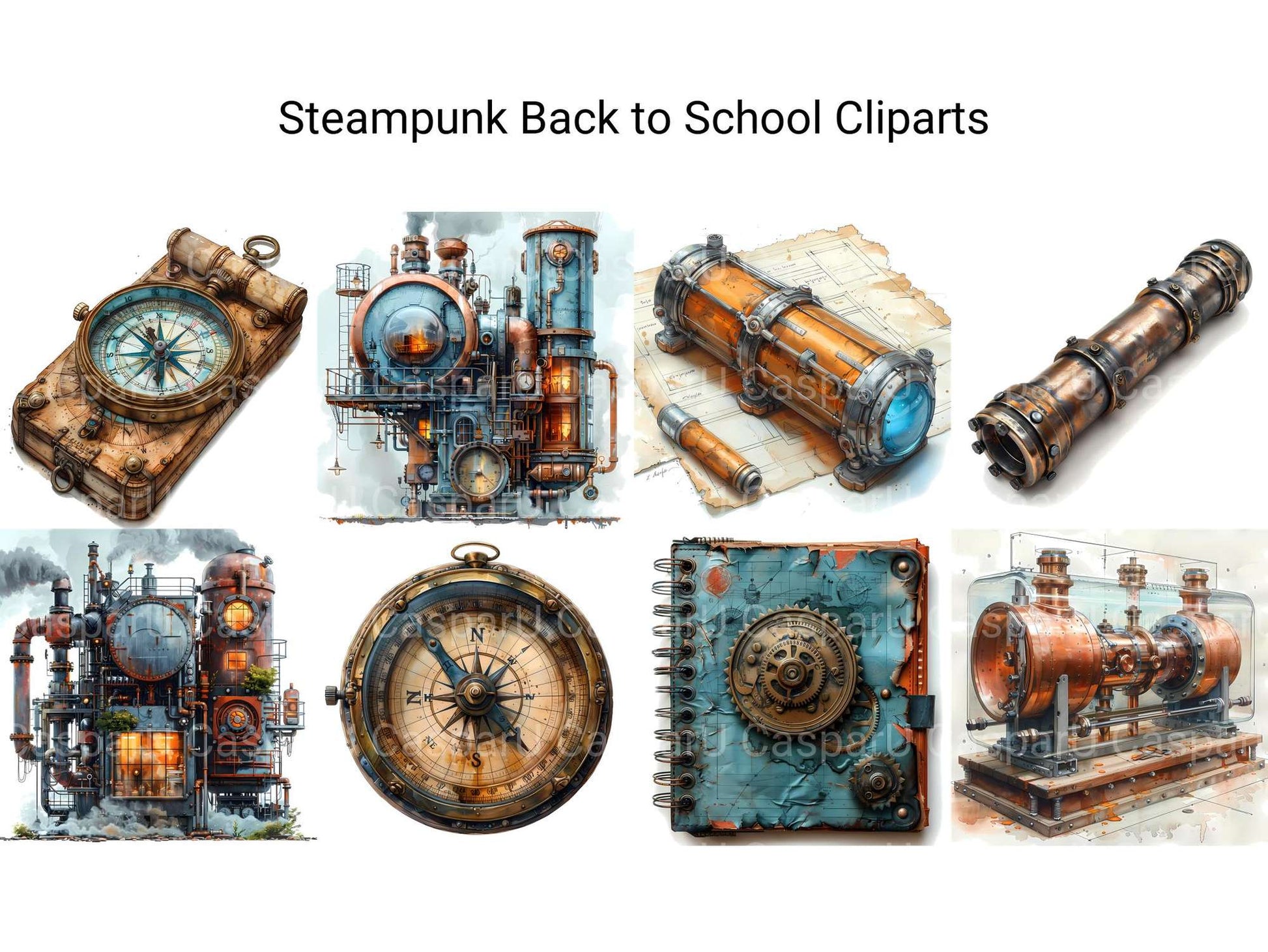 Step into a world where Victorian elegance meets futuristic imagination with steampunk-themed back-to-school cliparts. These illustrations blend gears, gadgets, and school supplies, perfect for a unique and creative design.