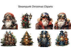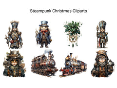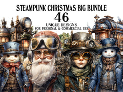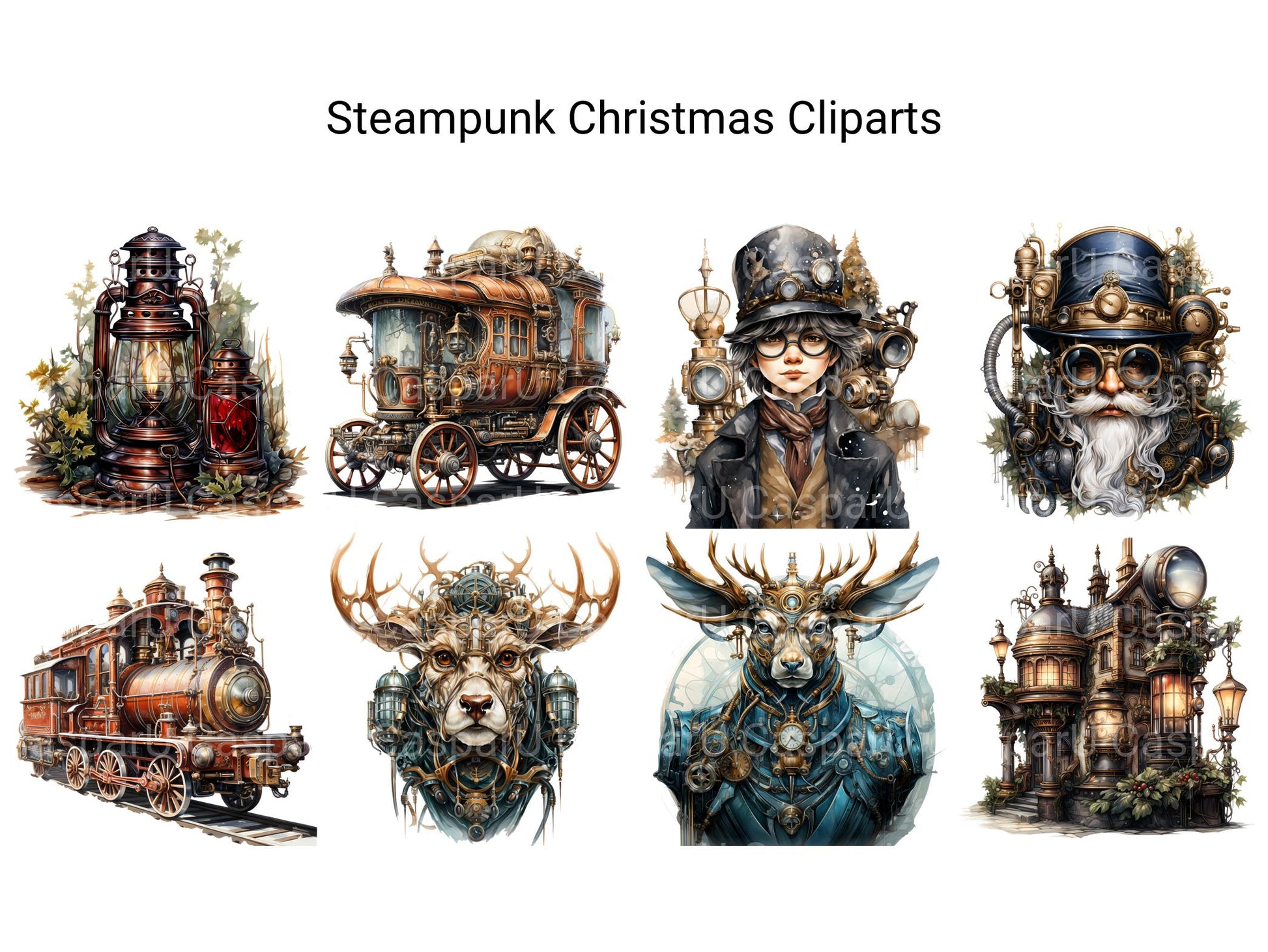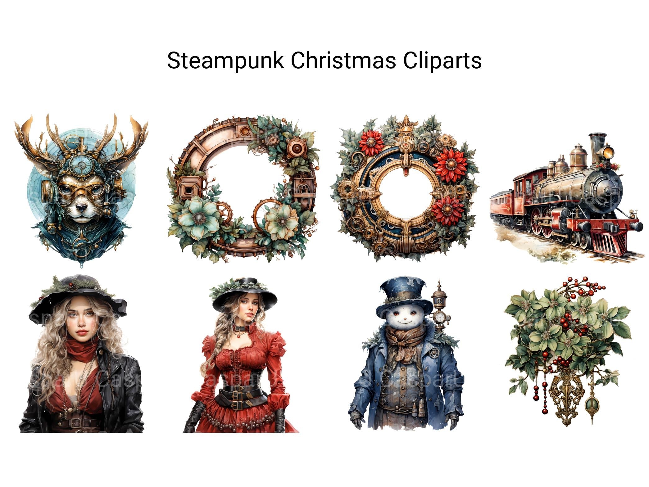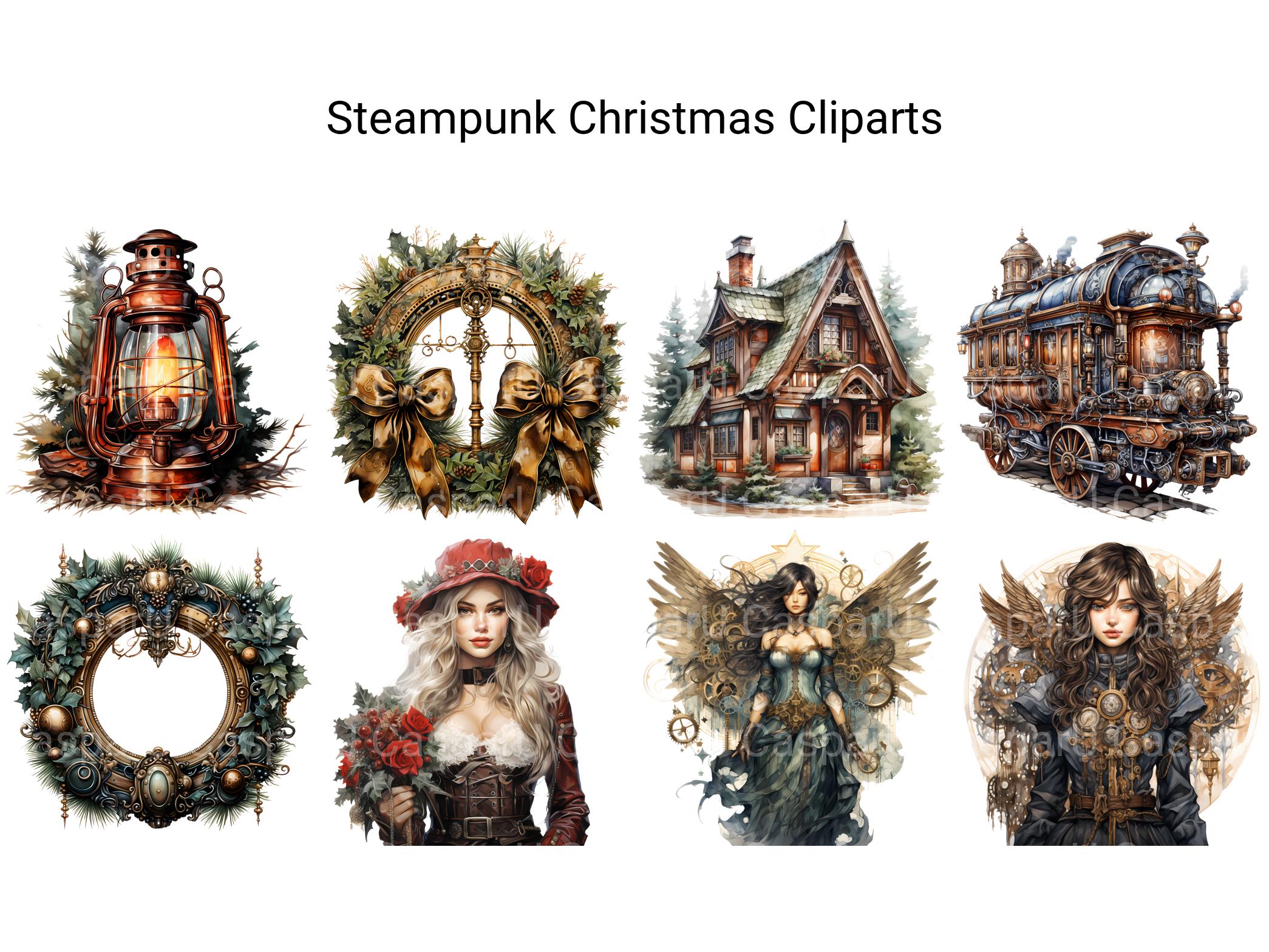 Embark on a fantastical journey through time and imagination with our Steampunk Christmas clip art. These digital illustrations blend Victorian elegance with mechanical marvels, featuring gears, gadgets, and festive steampunk designs, perfect for adding a touch of retro-futuristic charm and whimsical adventure to your Christmas projects, whether for cards, decorations, or themed events, transporting viewers to a world where steam-powered wonders meet holiday magic in a dazzling display of creativity.