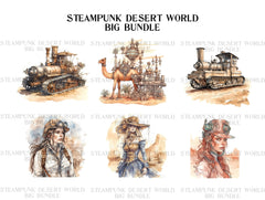 Traverse the sands of time in our Steampunk Desert World clip art. These evocative digital illustrations portray a desert landscape embellished with mechanical marvels, inviting you to wander through an arid expanse where the ancient allure of the desert meets the ingenuity of steampunk design.