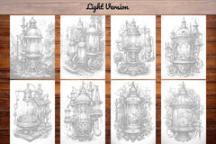 Illuminate your creativity with our digital coloring book showcasing intricate steampunk lantern designs! From ornate brass filigree to glowing Edison bulbs, each page invites you to explore the beauty and elegance of vintage illumination. Let your artistic vision shine as you adorn these mechanical lanterns with vibrant hues, capturing the nostalgic charm and timeless allure of steampunk lighting in every stroke.