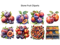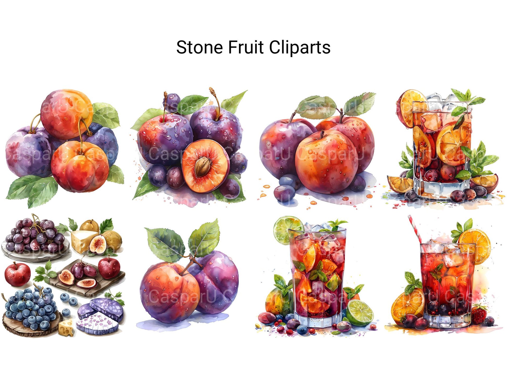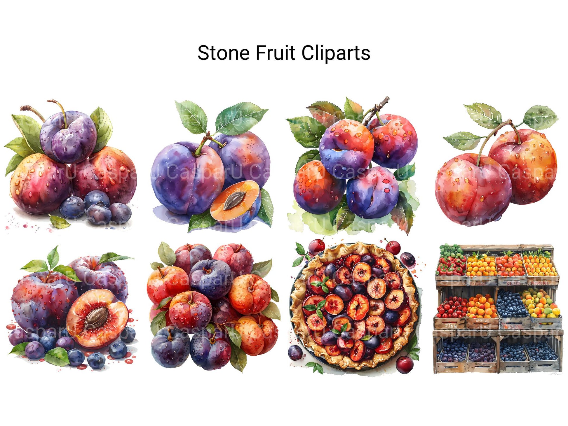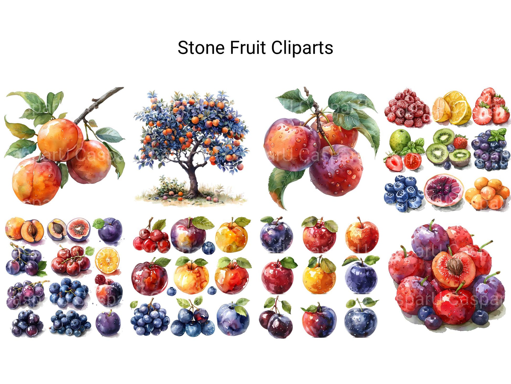 Explore the sweetness of summer with our Stone Fruit clipart. Featuring detailed illustrations of peaches, plums, and cherries, this set brings a juicy and vibrant touch to your designs. Perfect for fruit-themed projects.