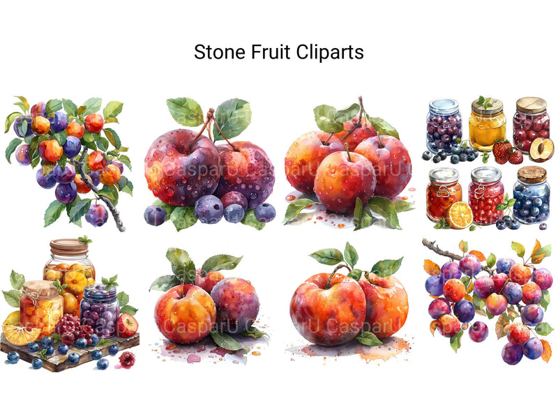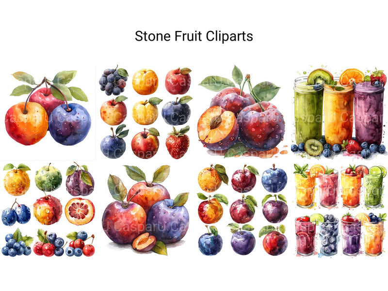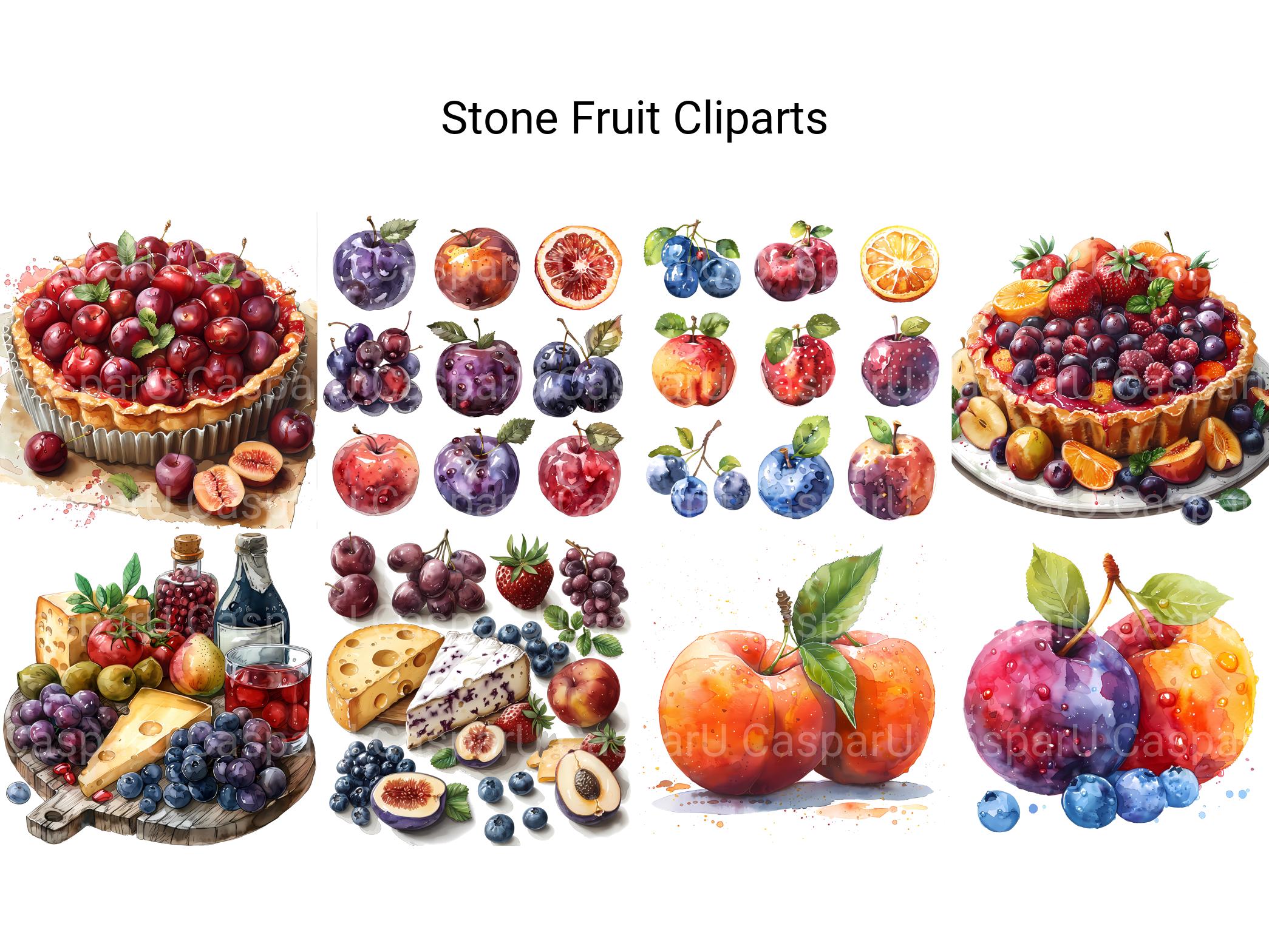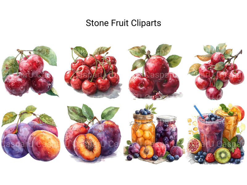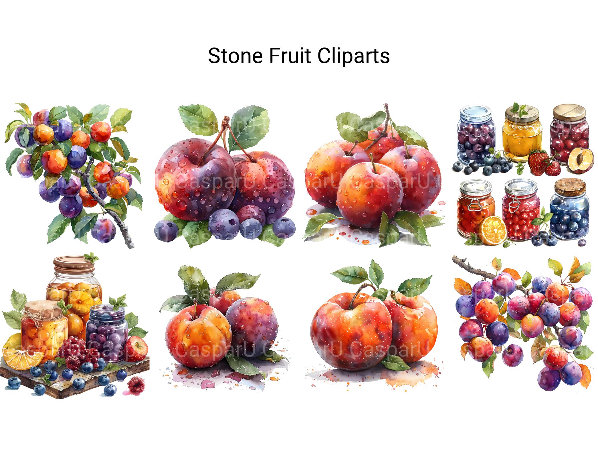 Explore the sweetness of summer with our Stone Fruit clipart. Featuring detailed illustrations of peaches, plums, and cherries, this set brings a juicy and vibrant touch to your designs. Perfect for fruit-themed projects.