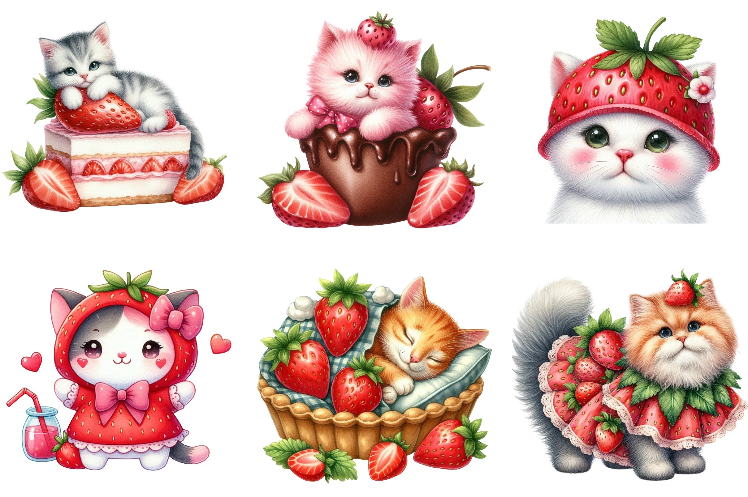 Unleash your imagination with this delightful collection of strawberry-themed cat illustrations, ideal for scrapbooking, invitations, and more.