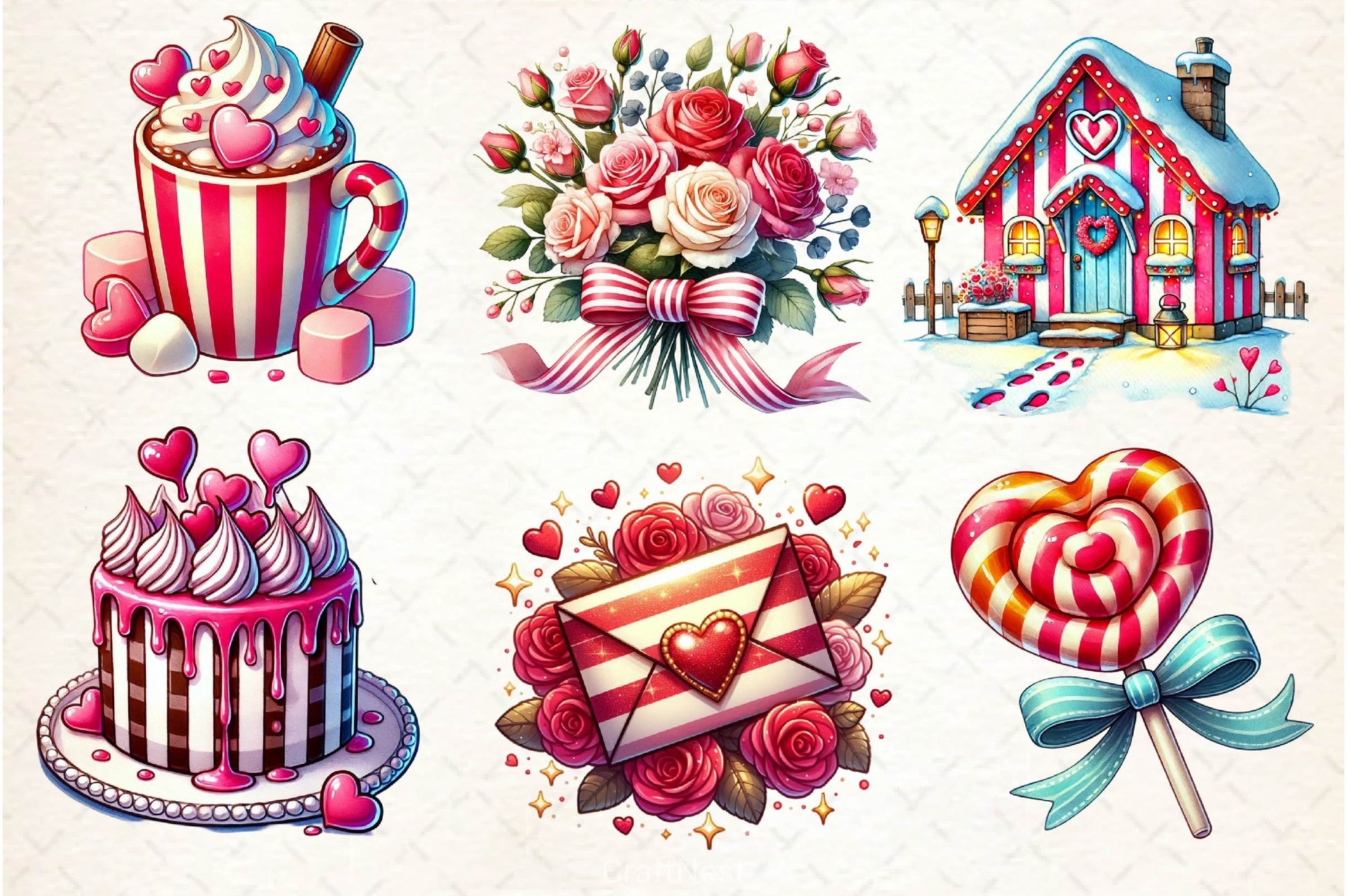 Love with this Striped Valentines Cottage Clipart Bundle, featuring romantic home designs, perfect for love nest crafts.