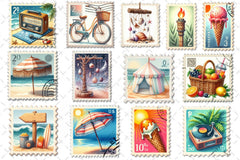 Mail with this Summer Beach Postage Stamp Clipart Bundle, featuring coastal postal designs, perfect for summer travel crafts.
