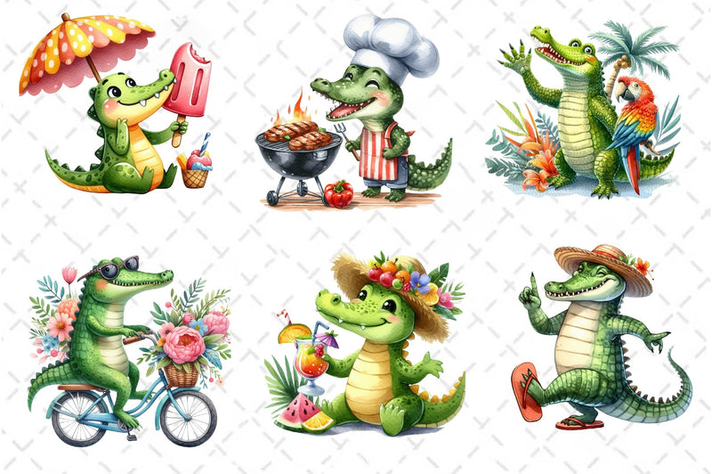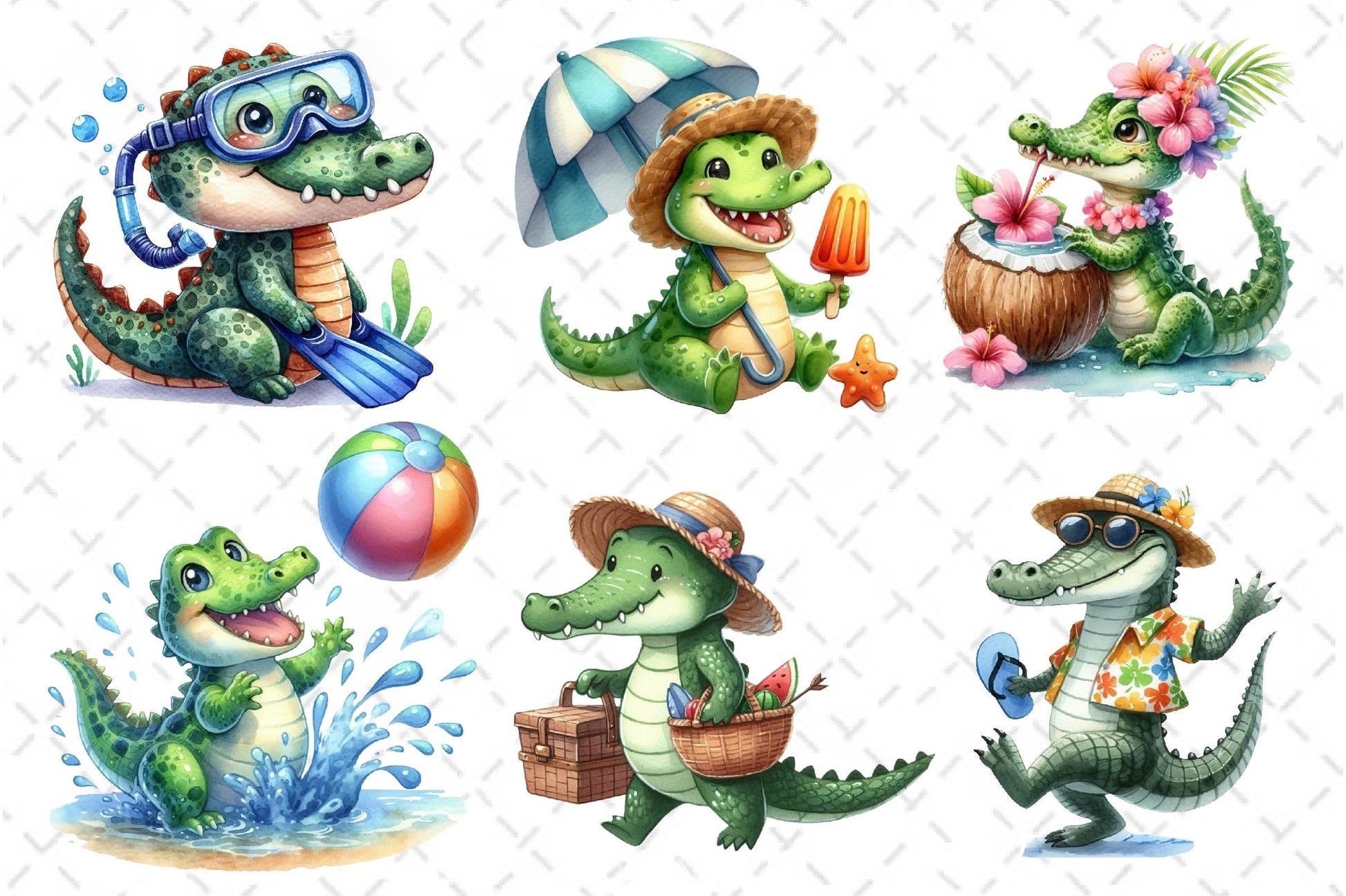 Friendly crocodiles enjoying summer activities for tropical themed projects.