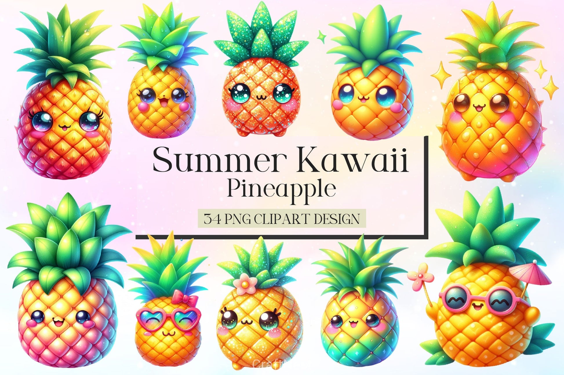 Tropical with this Summer Kawaii Pineapple Clipart Bundle, featuring cute pineapple designs, perfect for kawaii fruit crafts.
