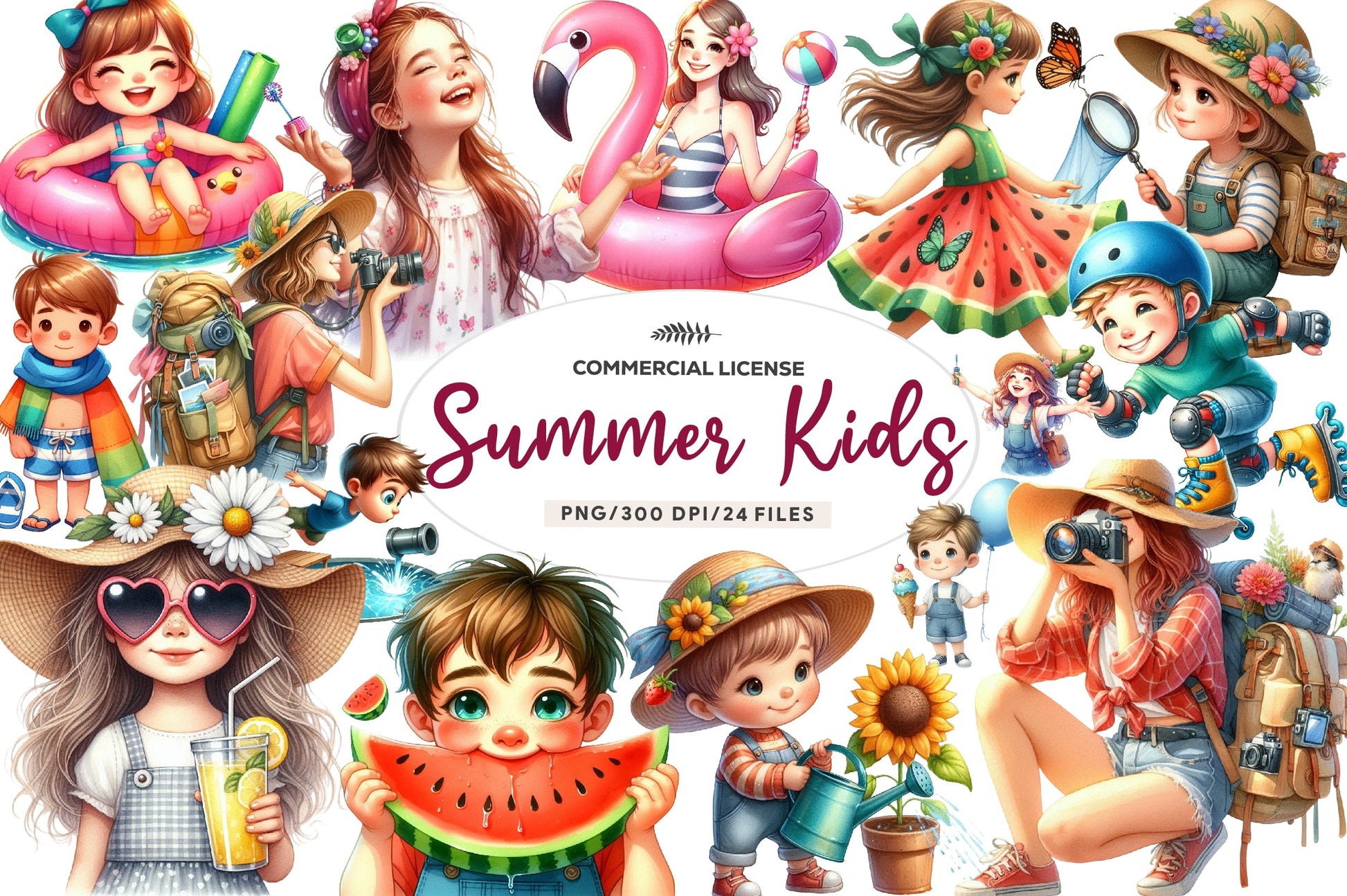 Play with this Summer Kids Clipart Bundle, featuring children summer designs, ideal for summer people crafts.