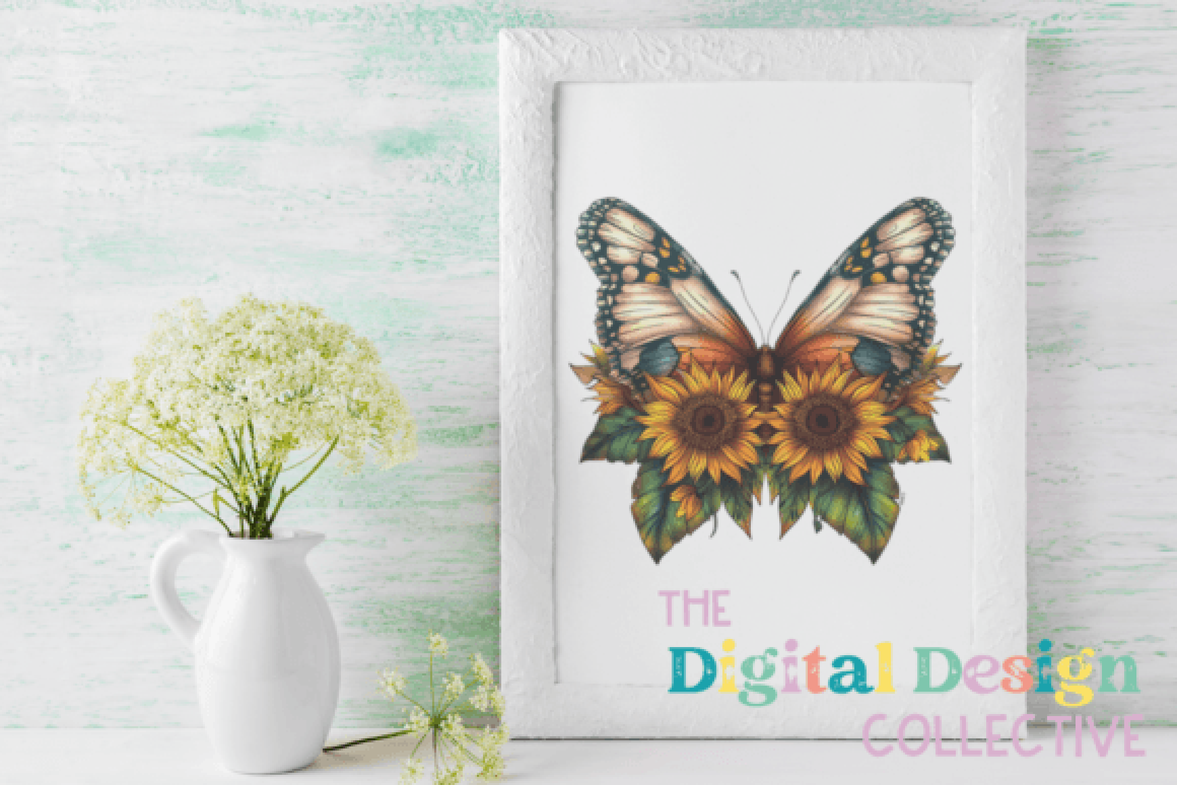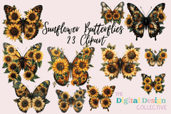 Transform your projects with the Sunflower Butterflies Clipart Bundle, featuring vibrant butterfly designs and sunflower motifs, perfect for creative crafts, digital scrapbooking, and enchanting invitations.