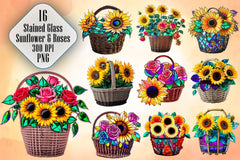 Beautiful sunflowers and roses in stained glass style for artistic flower projects.