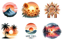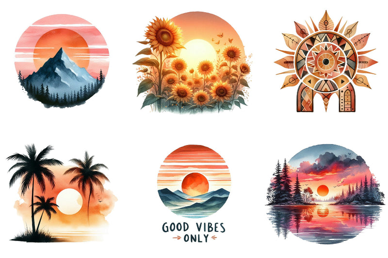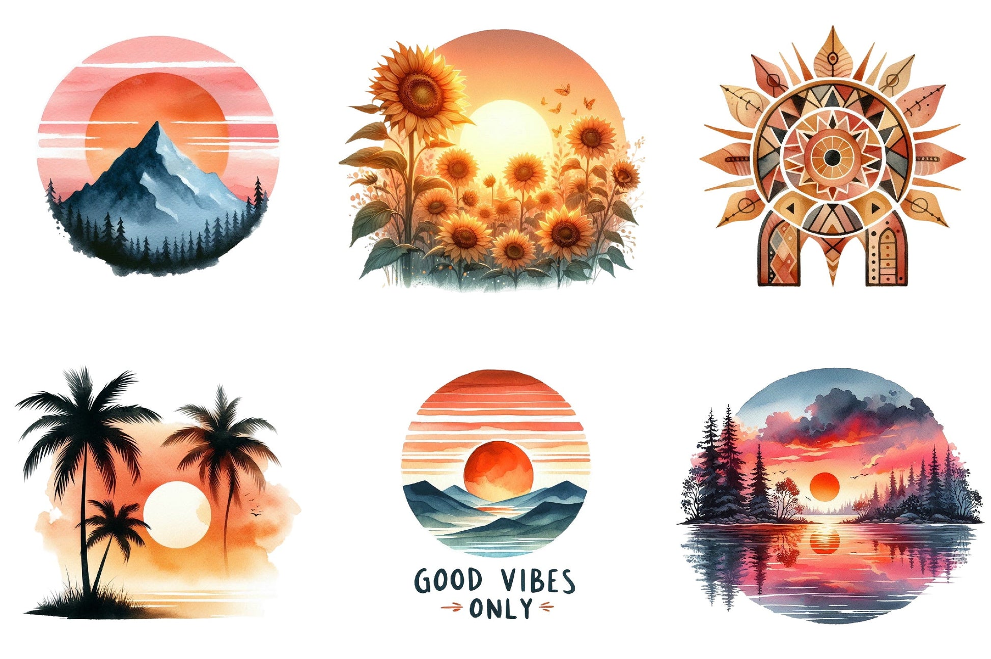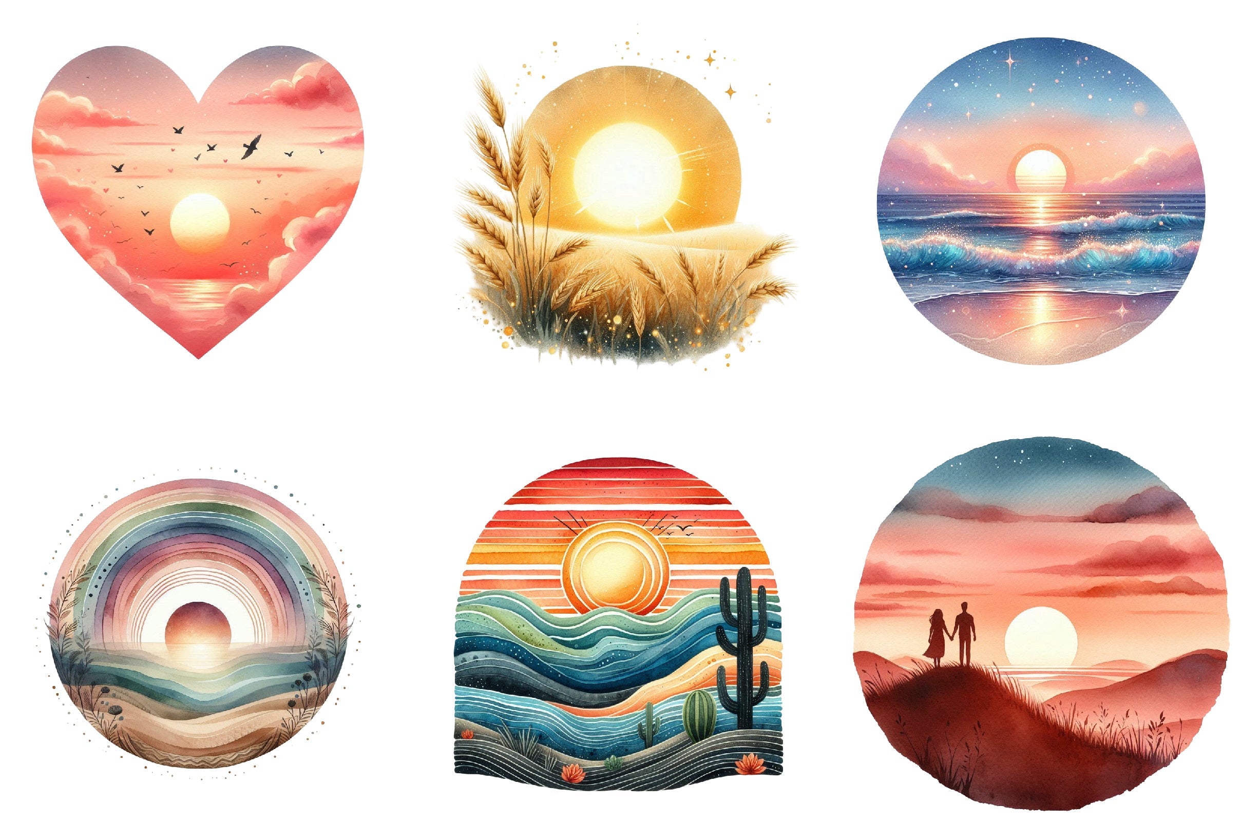 Transform your projects with the Sunset Sticker Clipart Bundle, featuring vibrant sunset designs perfect for scrapbooking, digital art, and creative crafts. Ideal for adding a touch of warmth and color to any project, these high-quality clipart images are a must-have for artists and crafters alike. Elevate your designs with this versatile collection, perfect for invitations, posters, and more.