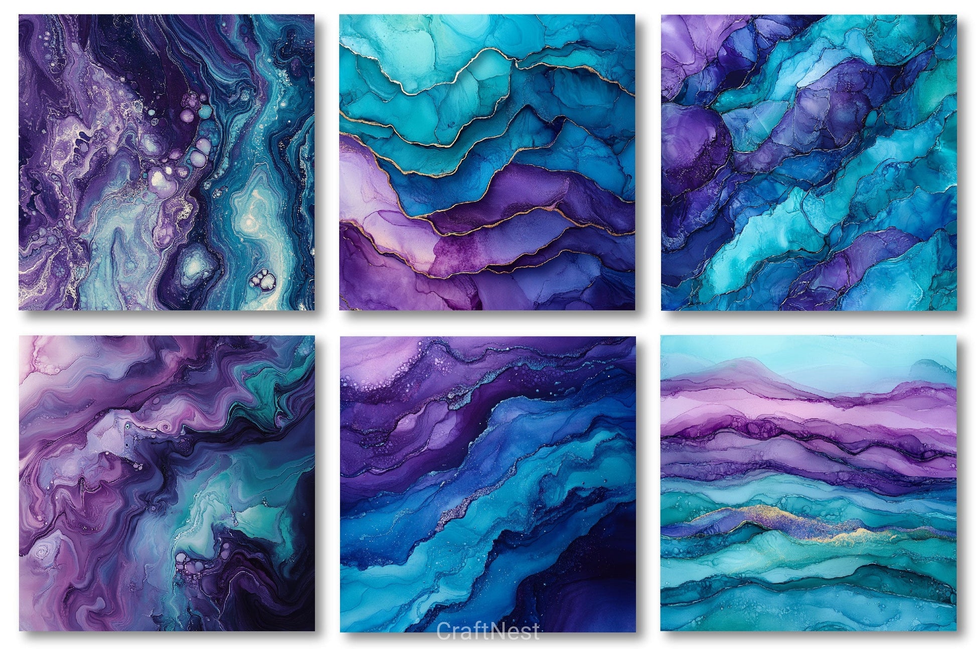 Flow with this Teal Purple Alcohol Ink Backgrounds Clipart Bundle, featuring fluid art designs, perfect for artistic background crafts.