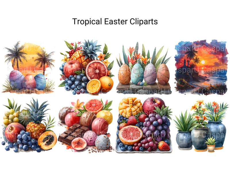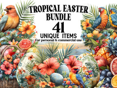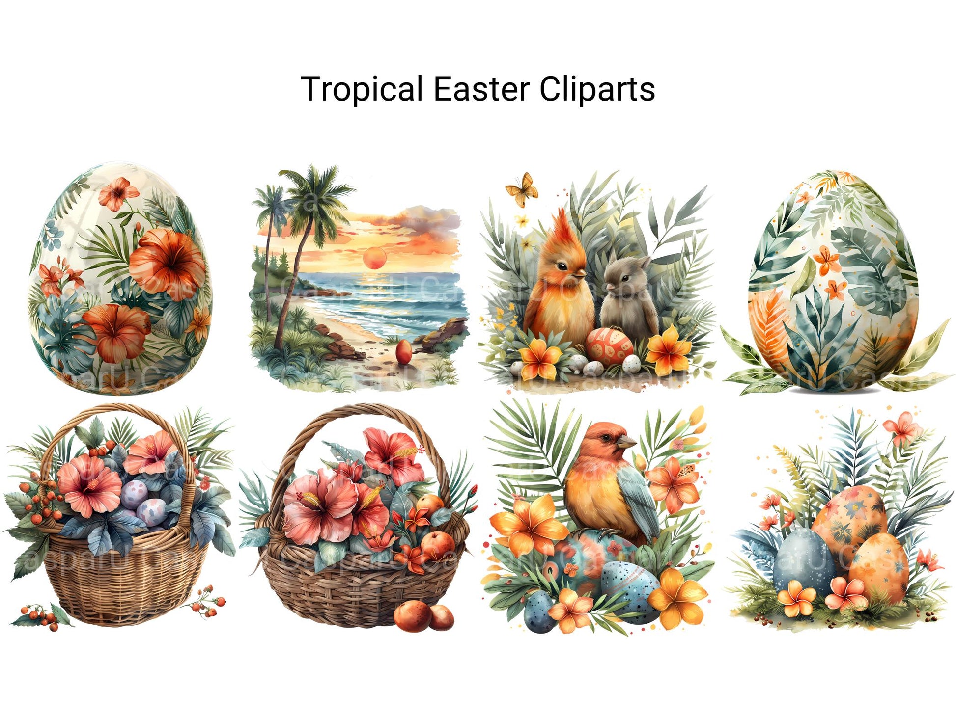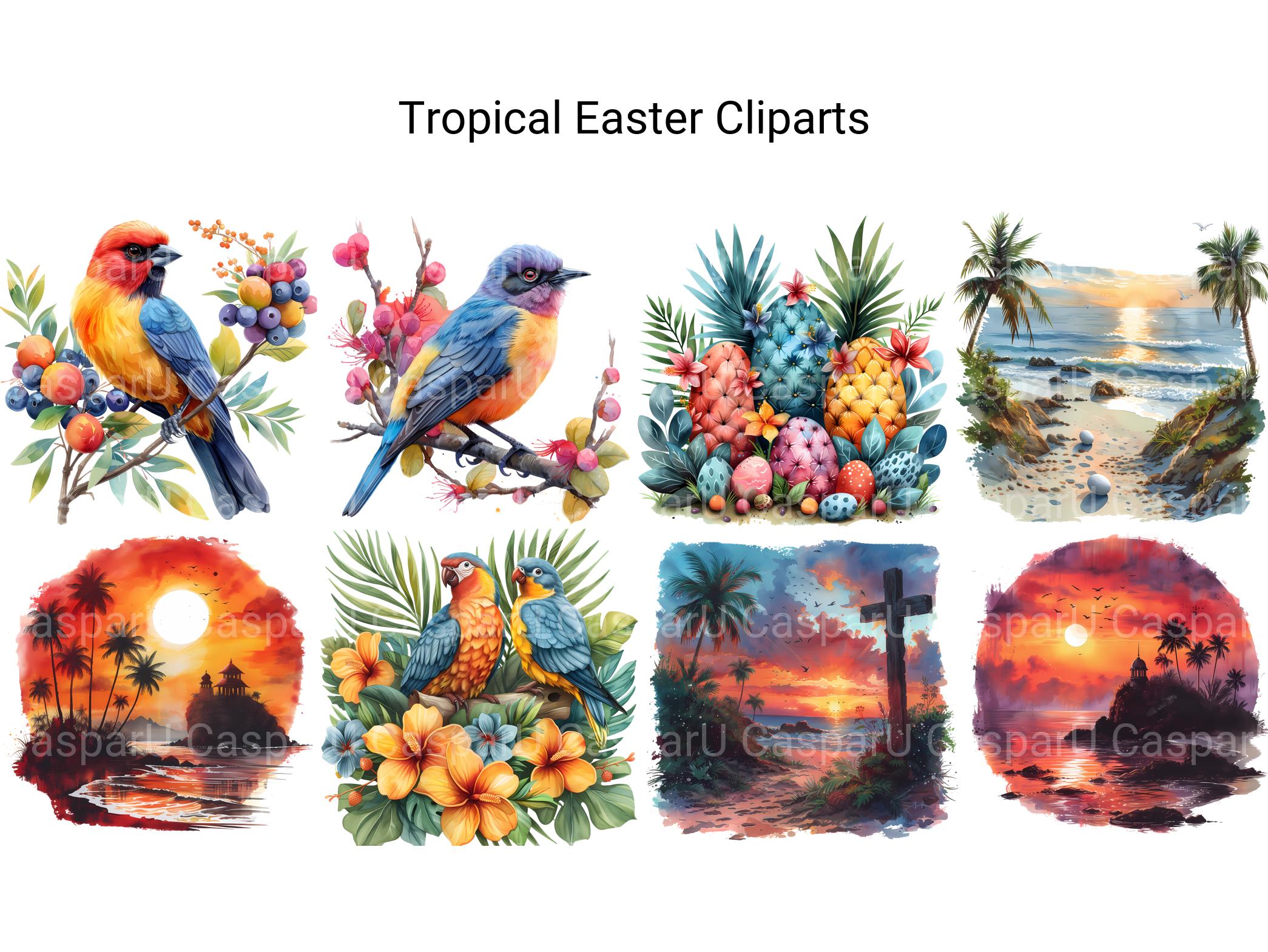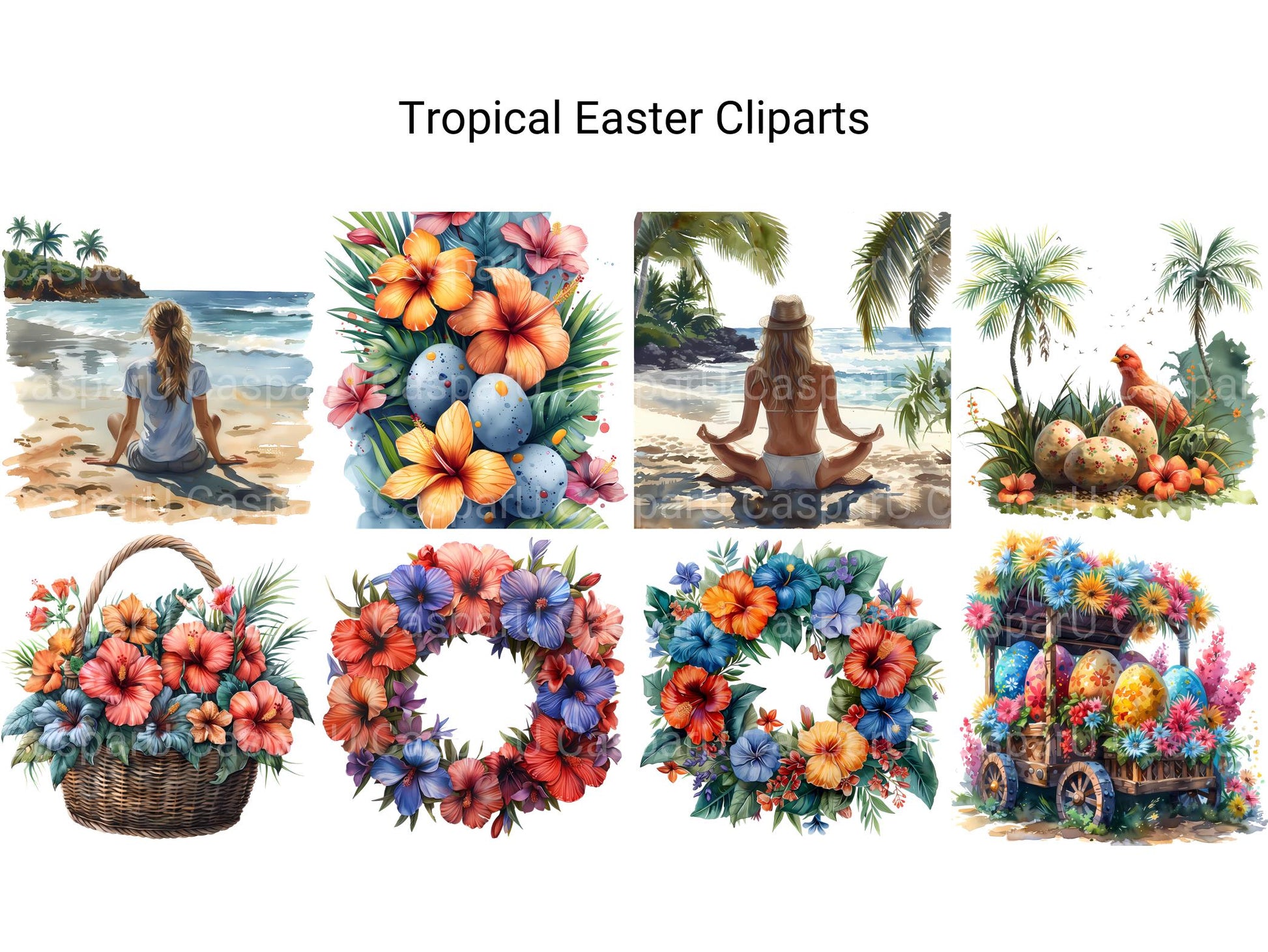 Transport yourself to a paradise of palm trees and sunny skies with Tropical Easter digital clip art, featuring vibrant tropical motifs, exotic flowers, and lush greenery that capture the essence of a tropical Easter celebration. These breezy images infuse Easter with a touch of island charm and tropical flair, perfect for adding a splash of color and relaxation to your projects. Let Tropical Easter whisk you away on a tropical escape and infuse your designs with the laid-back vibe of island life this Easter.