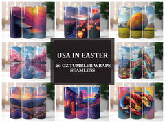 Infuse your Easter celebration with American pride using USA in Easter seamless tumbler wraps. Showcasing bold designs and iconic landmarks, these wraps capture the essence of the USA in vibrant detail. Whether you're enjoying brunch with family or relaxing in the backyard, these wraps add a patriotic touch to your tumbler, making every sip a tribute to the rich culture and heritage of the United States.