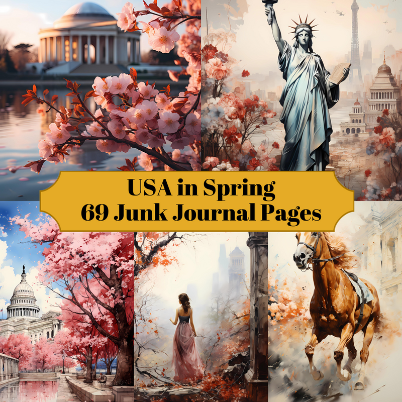 Discover the beauty of America in springtime with our USA in Spring-themed digital junk journal. Featuring iconic landmarks, scenic vistas, and patriotic motifs, this journal offers a patriotic space for capturing memories, doodling, and expressing your creativity amidst the breathtaking landscapes and vibrant spirit of the United States in springtime, perfect for those who love to explore the diverse wonders and rich heritage of America amidst the blossoming beauty of the season.