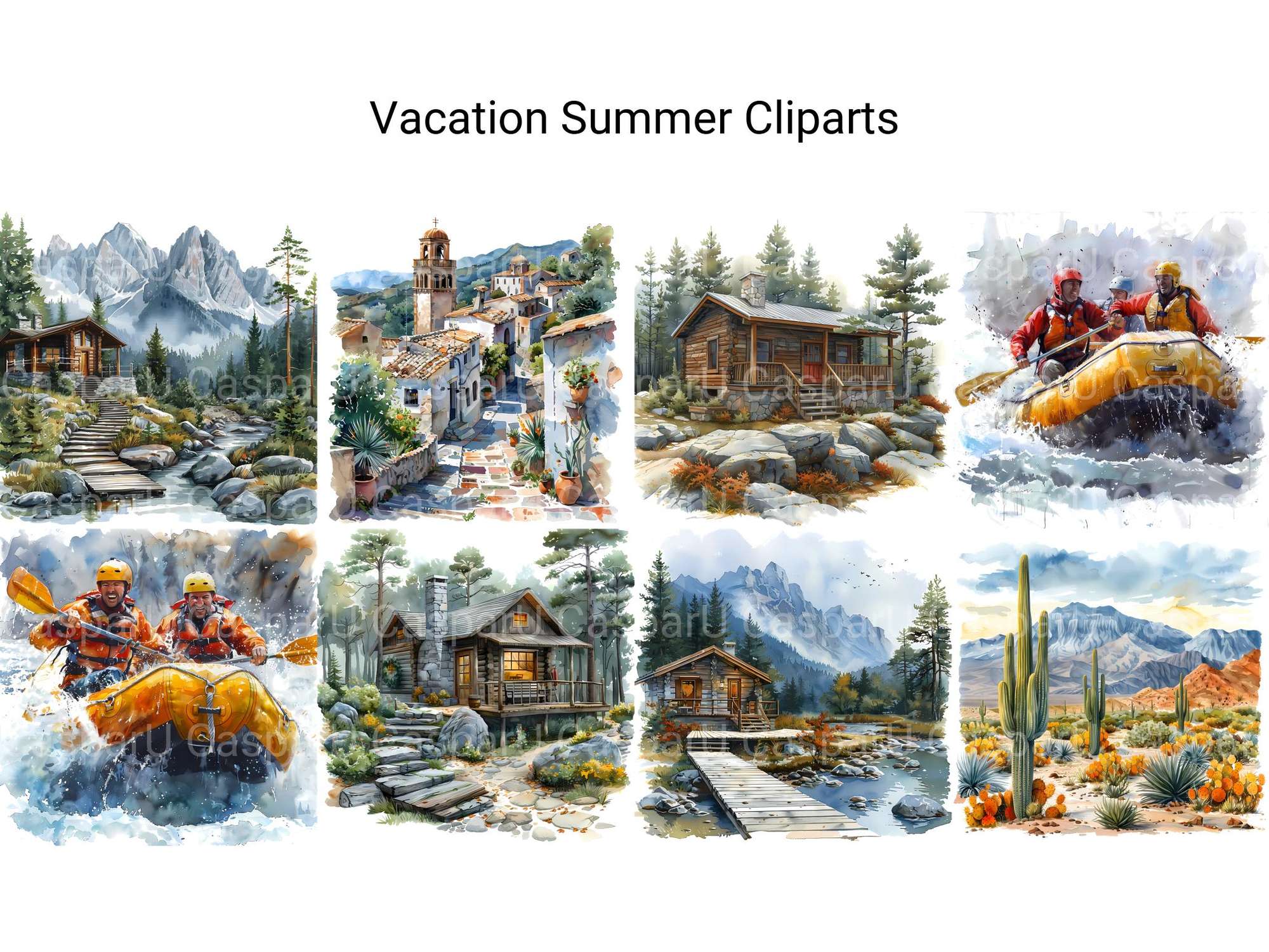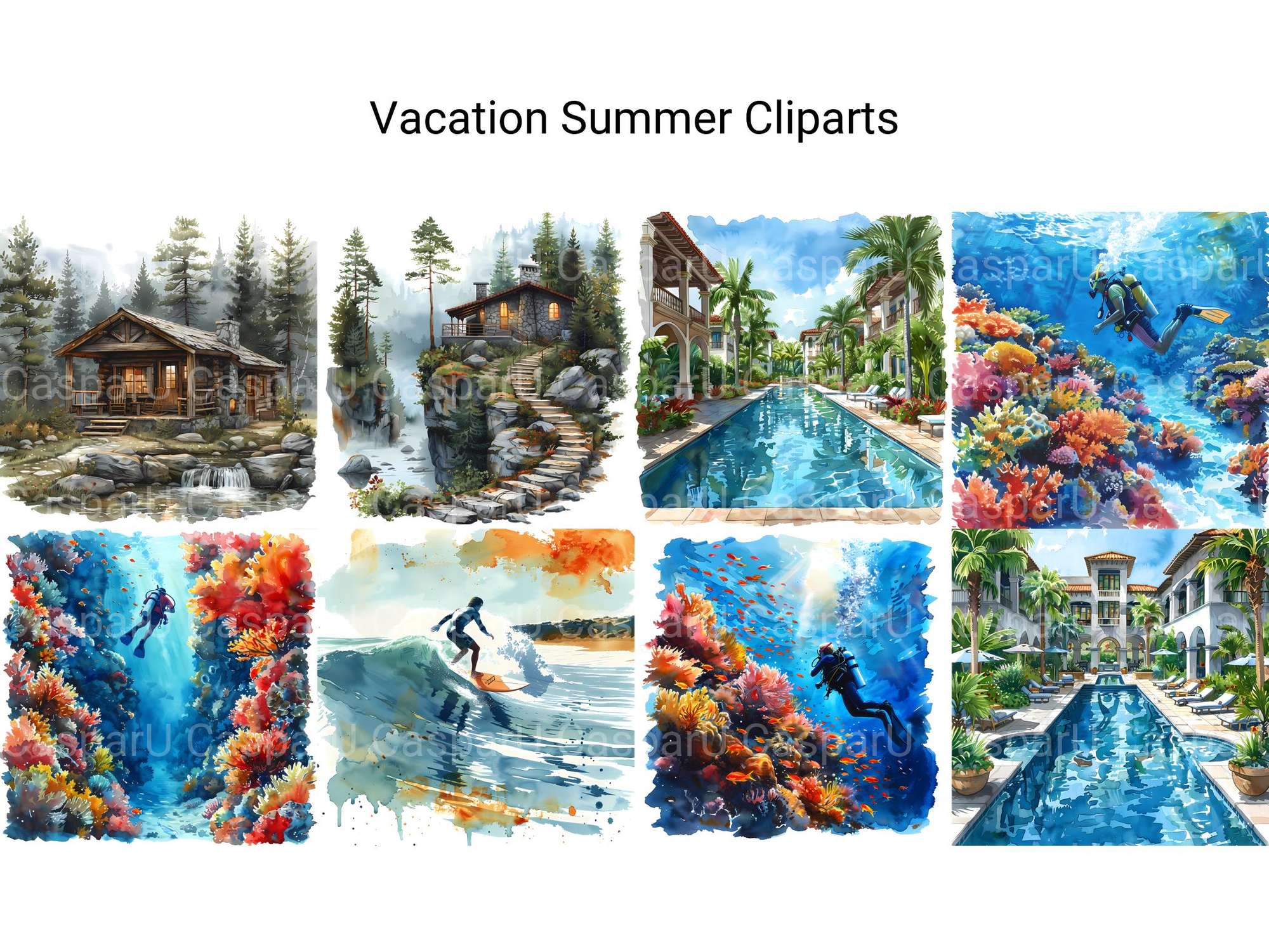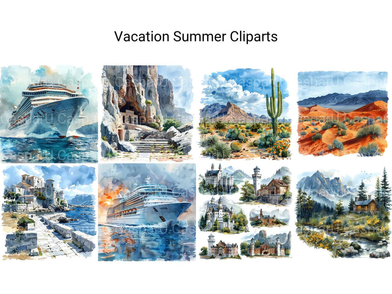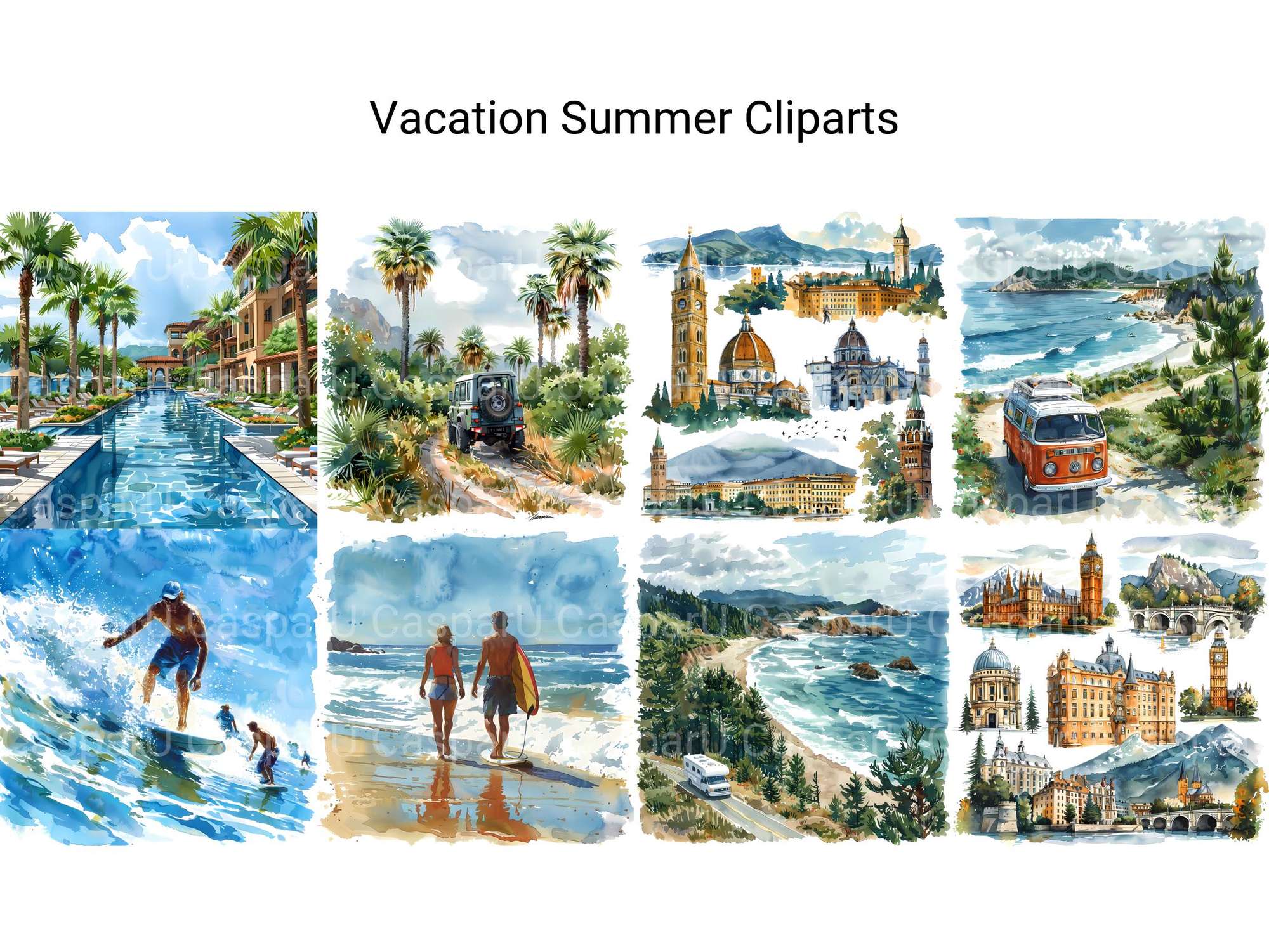 Embark on a getaway with our Vacation Summer clipart, featuring cheerful illustrations of travel essentials, scenic destinations, and relaxing holiday scenes. These designs capture the joy and excitement of summer vacations, perfect for adding a travel-inspired touch to your creations.