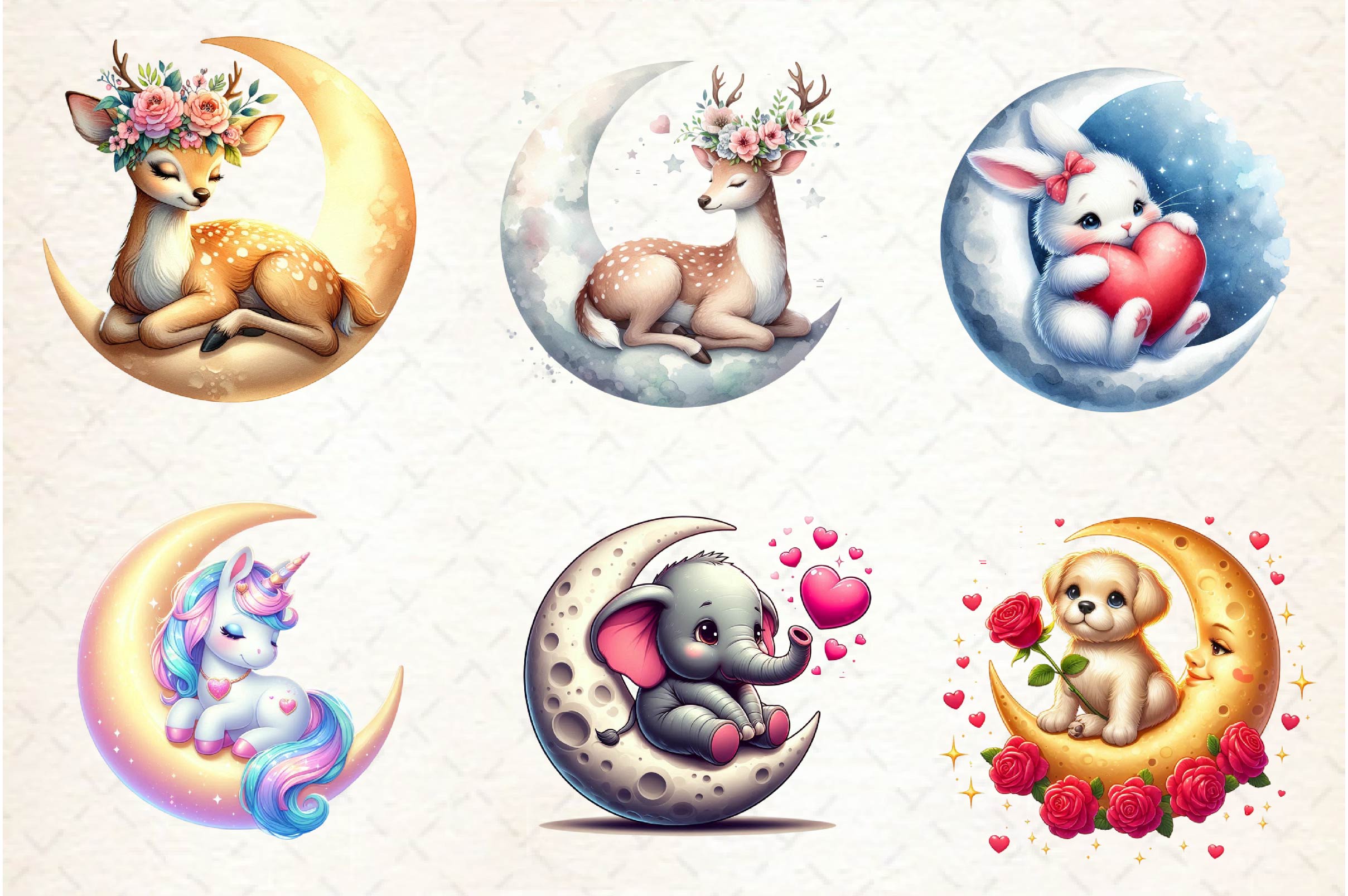 Orbit with this Valentine Animal On Moon Clipart Bundle, featuring celestial romantic designs, ideal for space Valentine's crafts.