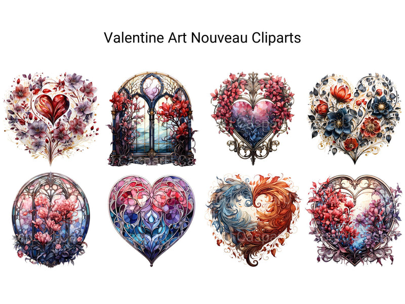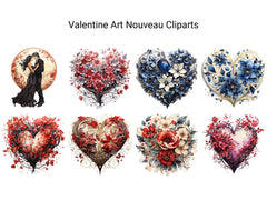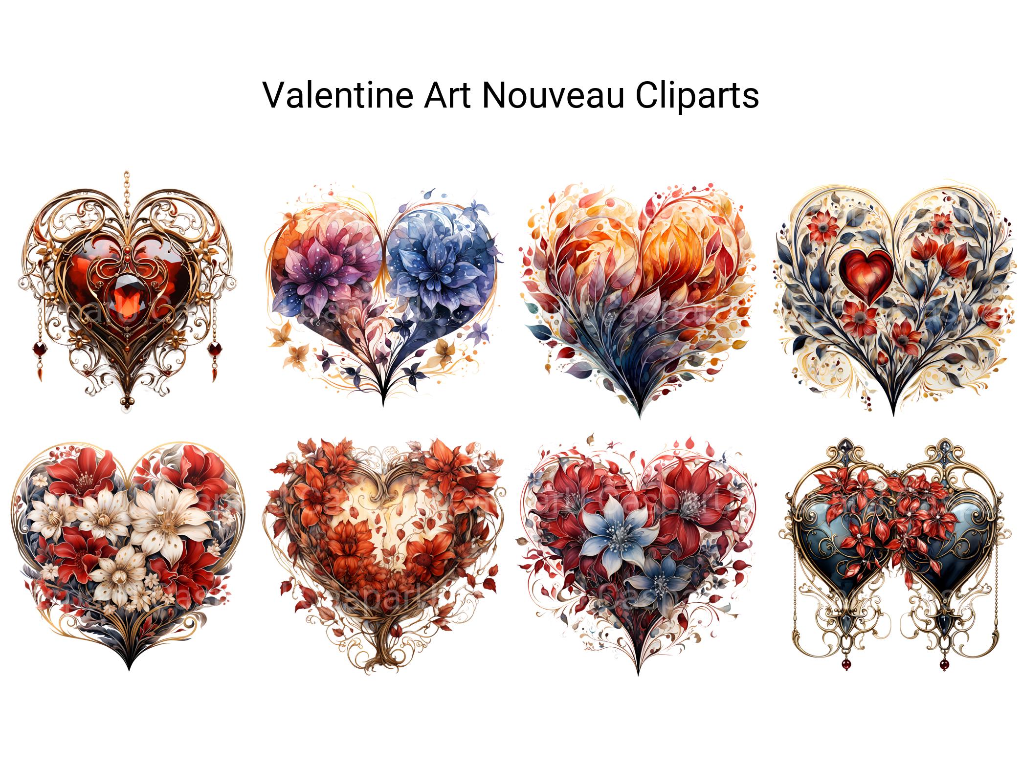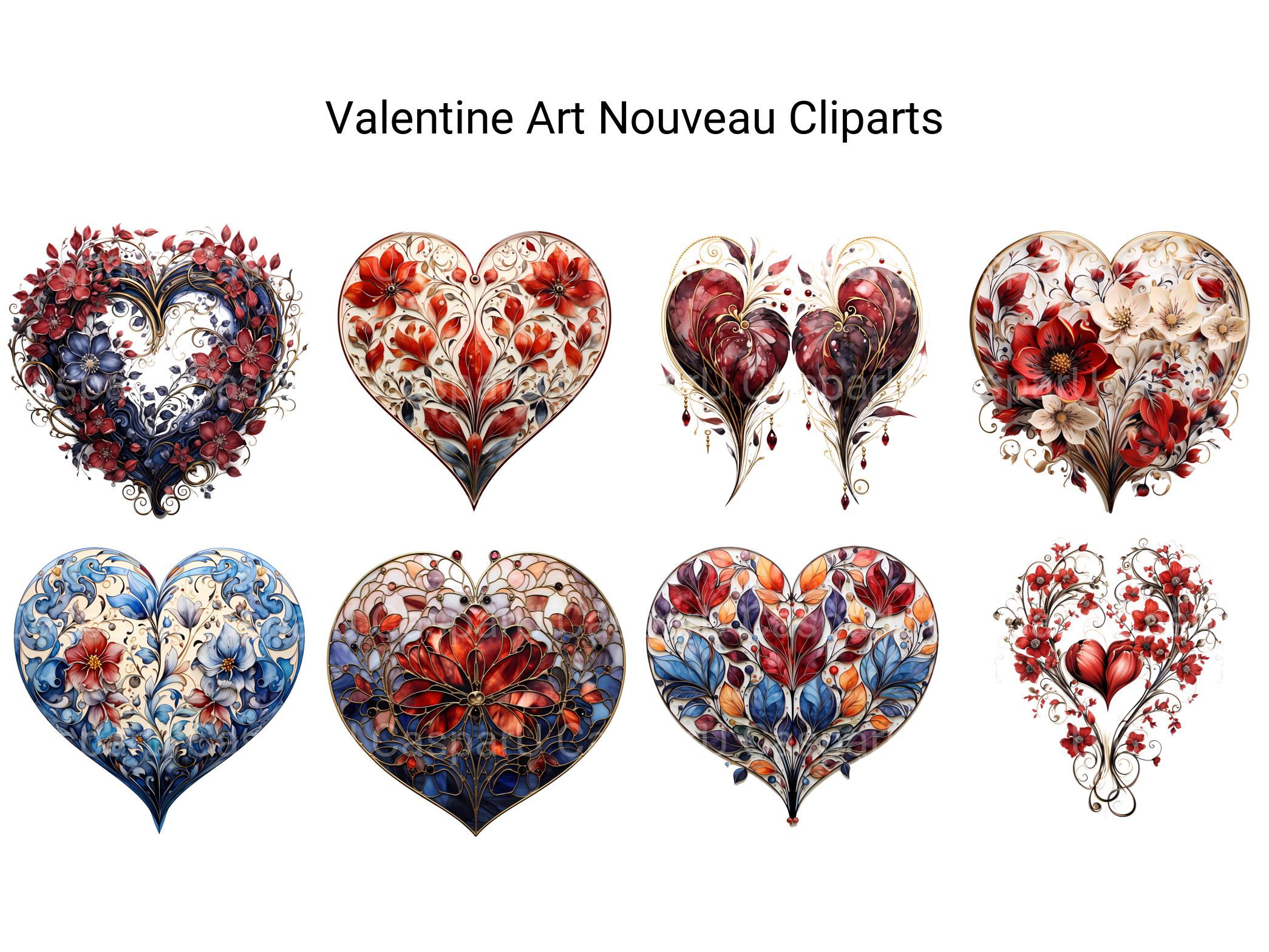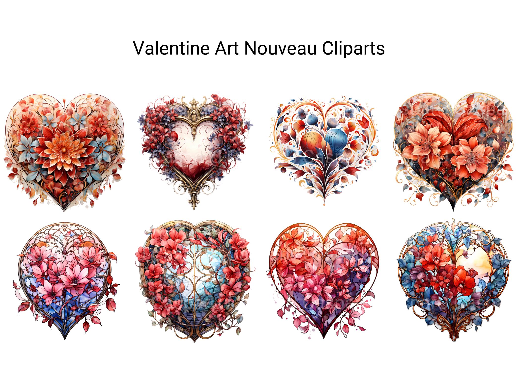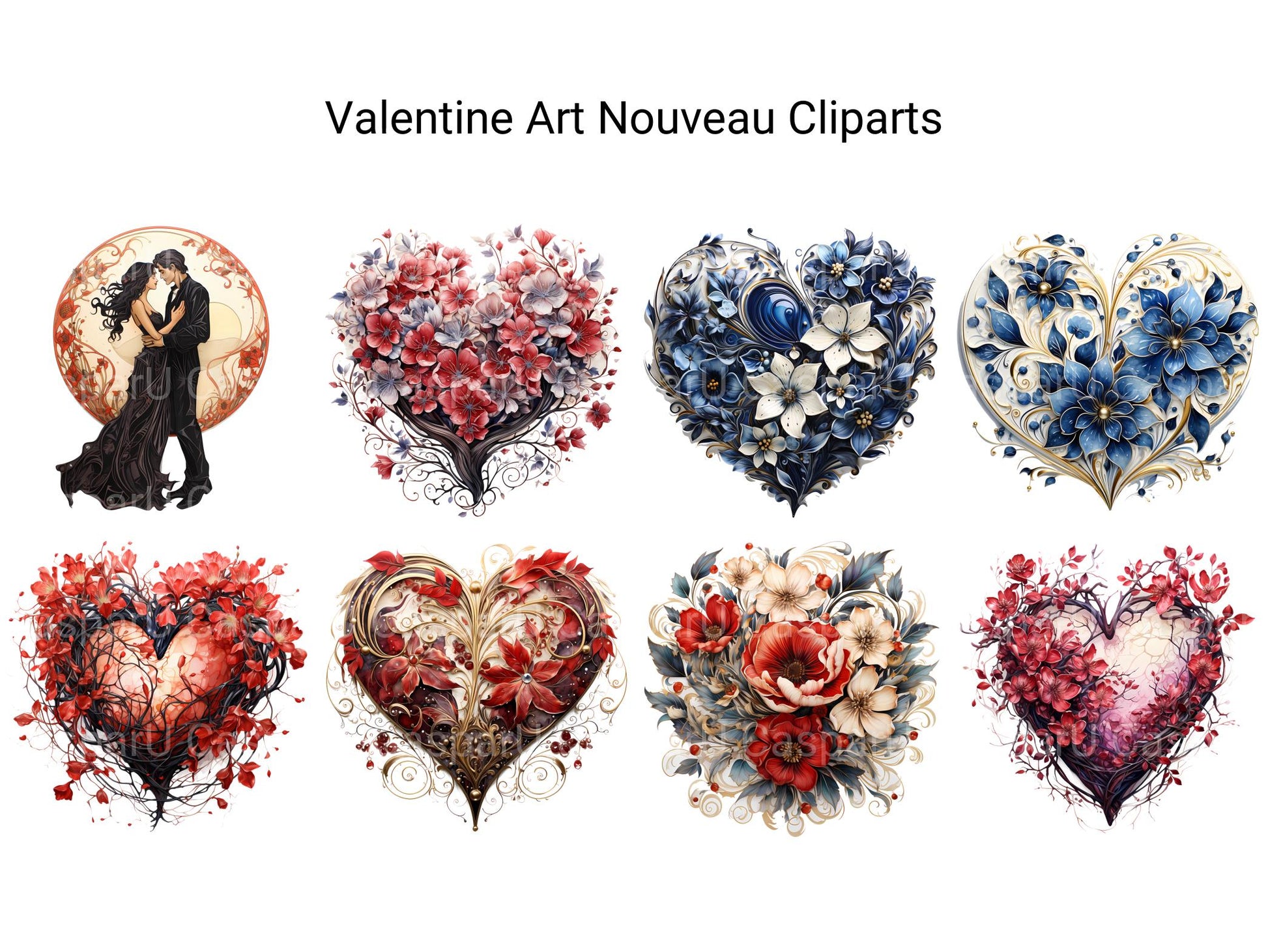 Immerse yourself in the elegance of Art Nouveau with digital clip art featuring Valentine's Day illustrations inspired by the iconic style. With flowing lines and intricate details, these graceful images evoke the romance and sophistication of the Belle Époque era, perfect for adding a touch of vintage charm to your Valentine's Day projects. Let the timeless allure of Art Nouveau captivate your celebrations, inviting viewers to revel in the beauty of love's artistic expression.