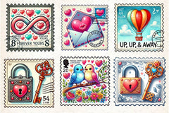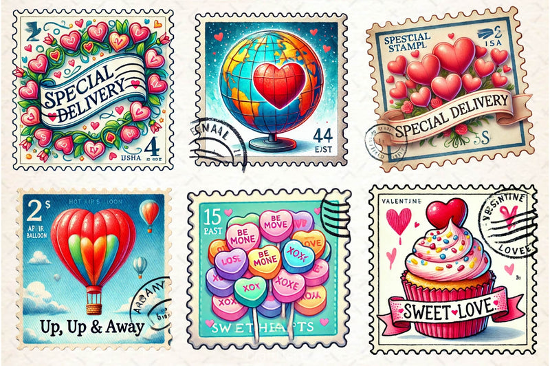 Romantic Valentine's Day postage stamp designs for love mail projects.