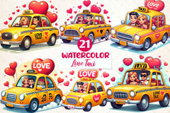 Drive with this Valentines Love Taxi Clipart Bundle, featuring romantic vehicle designs, ideal for transportation Valentine's crafts.
