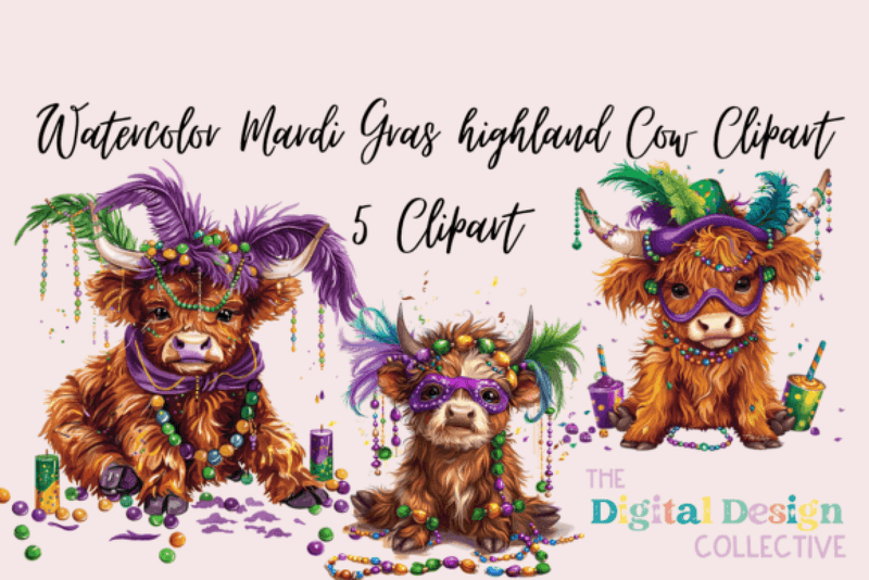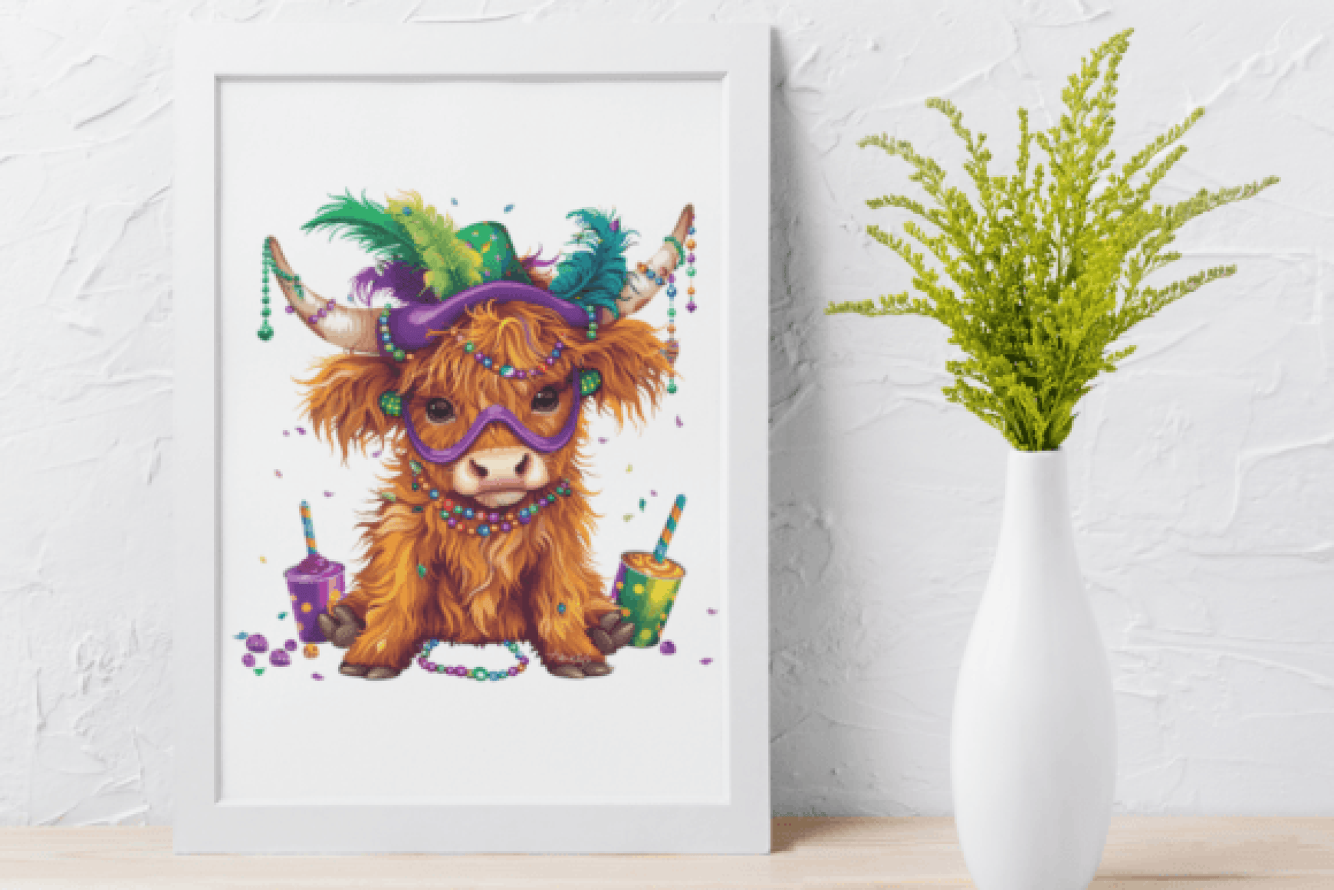Unleash the spirit of Mardi Gras with our Mardi Gras Cows: Vibrant Carnival Art Bundle. This captivating collection features lively cow designs adorned in festive carnival attire, perfect for adding a splash of color to your creative projects. Ideal for party decorations, crafts, and more, these unique illustrations bring the joyous essence of Mardi Gras to life.