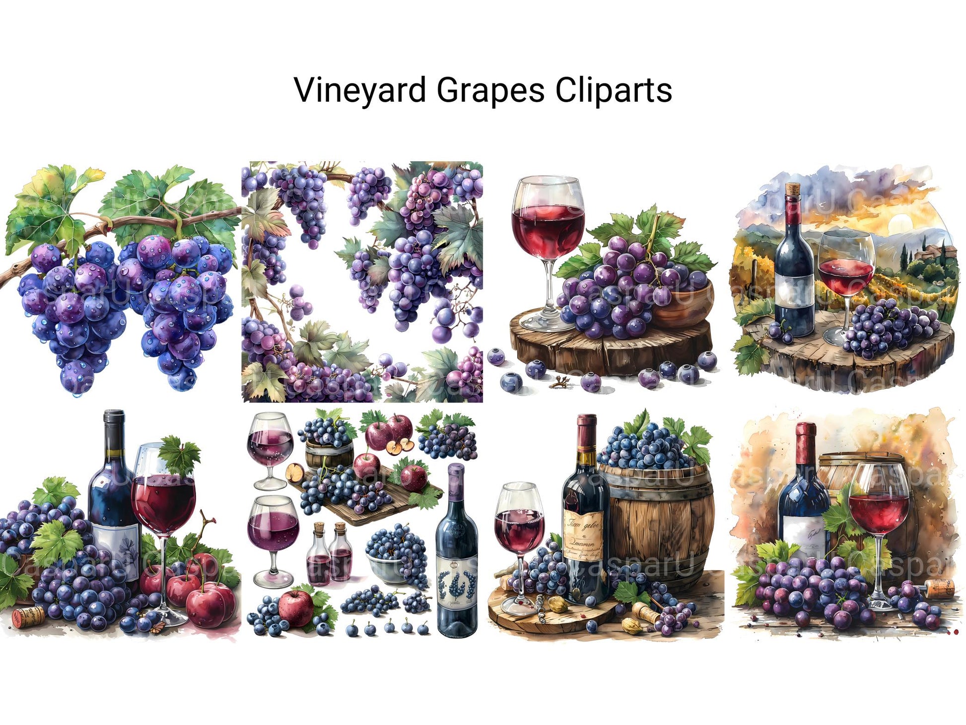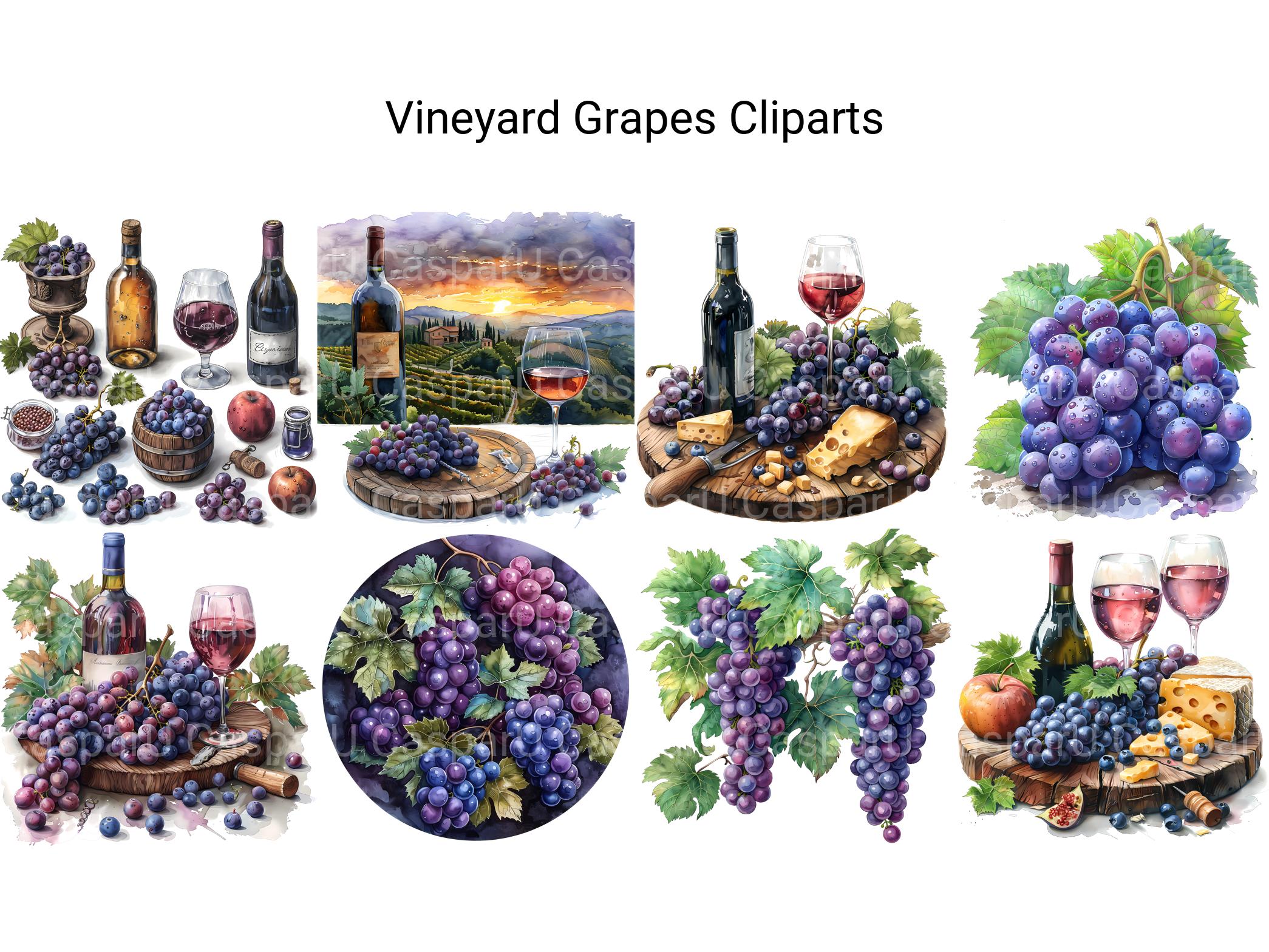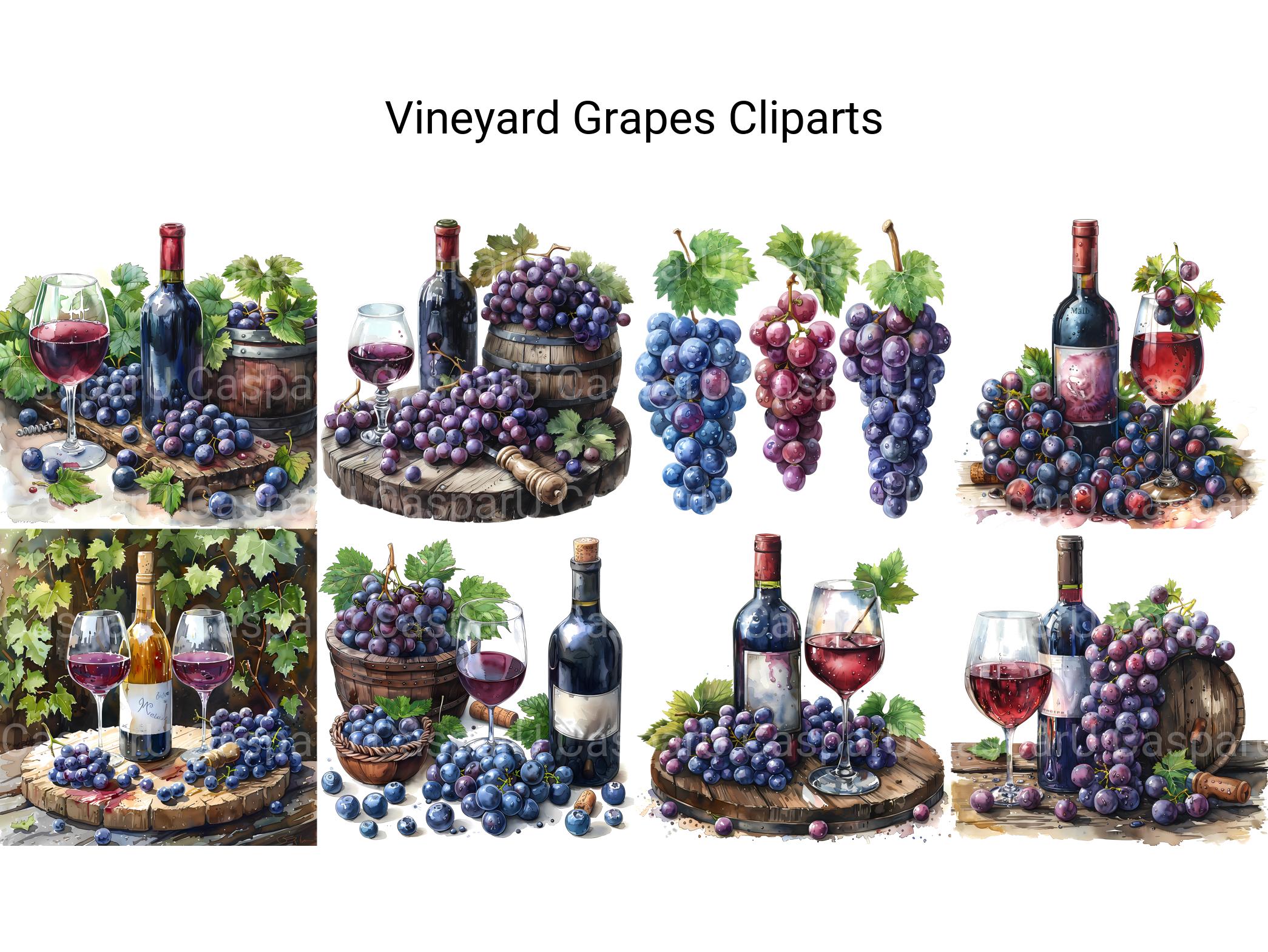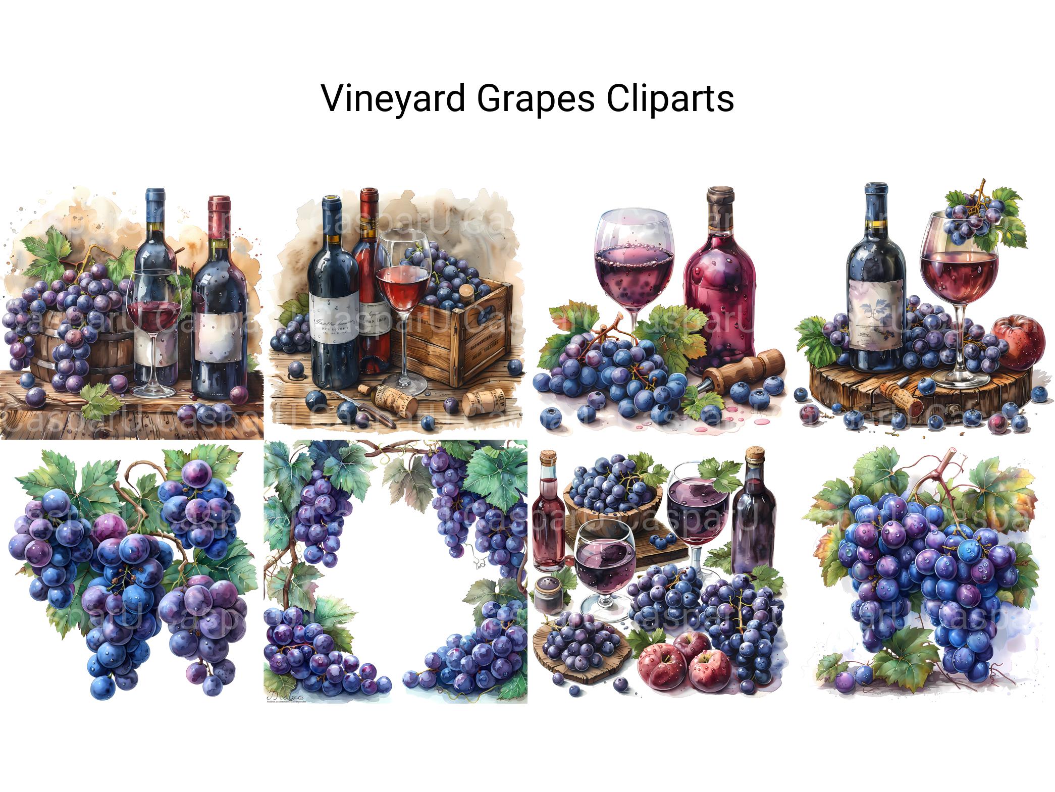Celebrate the rich colors of the harvest with our Vineyard Grapes clipart. Featuring detailed illustrations of clusters of grapes, this set adds a touch of elegance and natural beauty to your projects. Ideal for vineyard or fruit-themed designs.