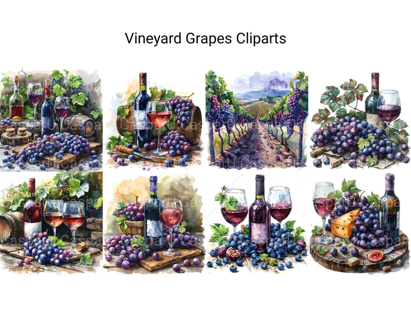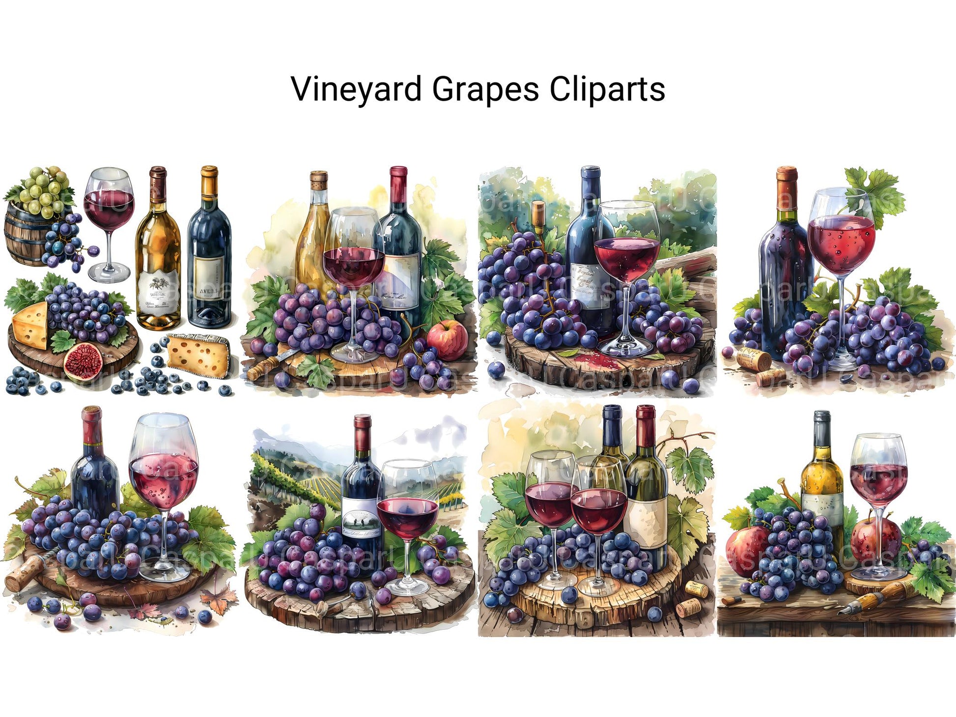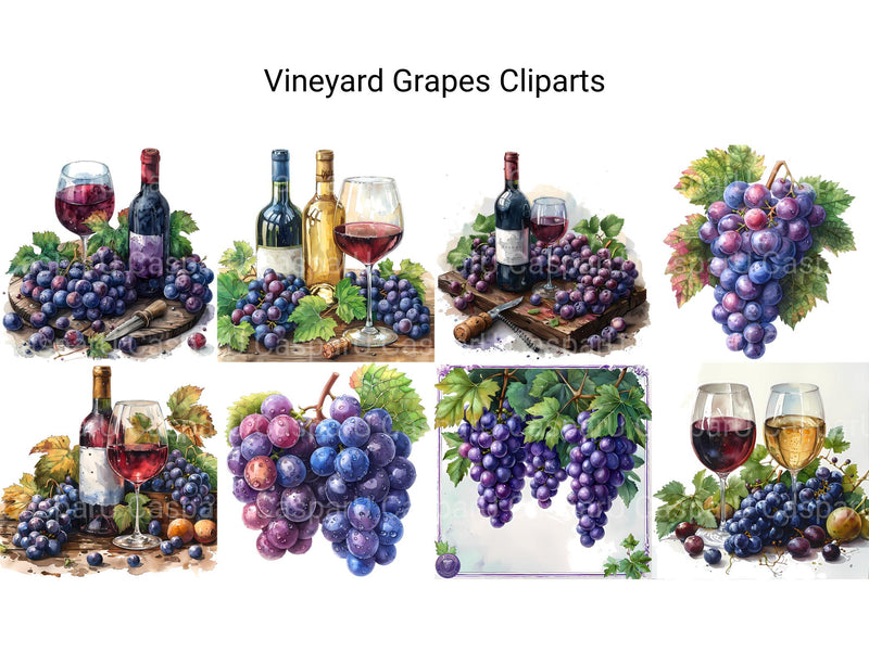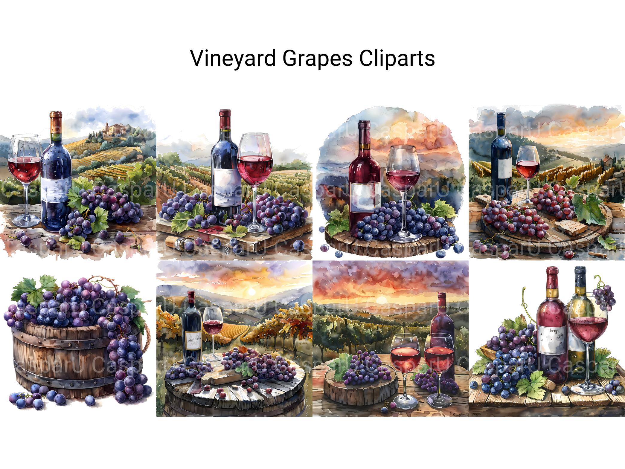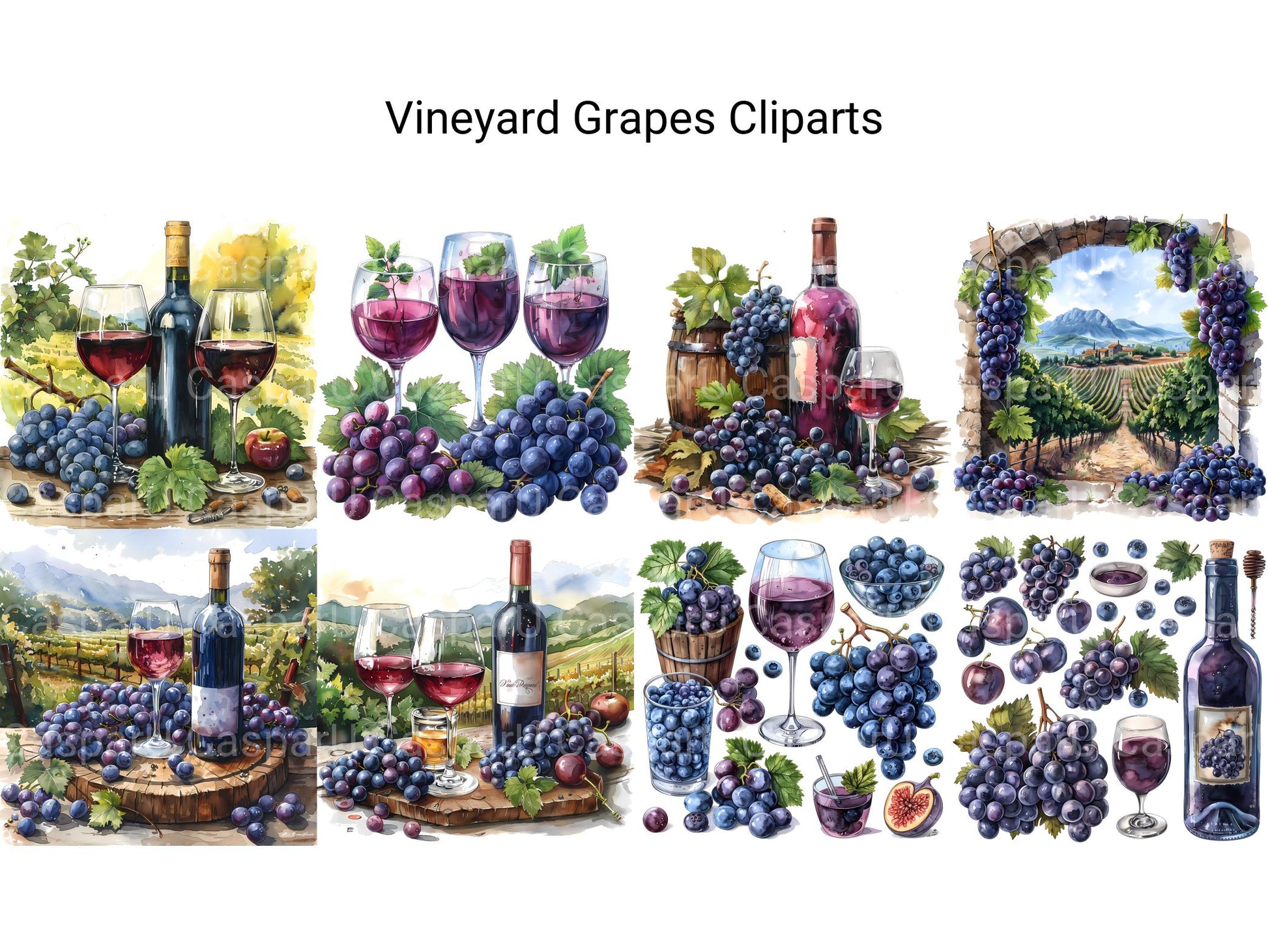 Celebrate the rich colors of the harvest with our Vineyard Grapes clipart. Featuring detailed illustrations of clusters of grapes, this set adds a touch of elegance and natural beauty to your projects. Ideal for vineyard or fruit-themed designs.