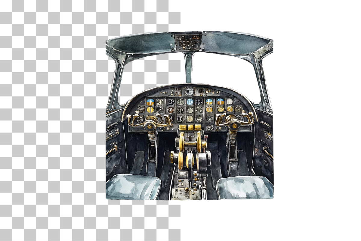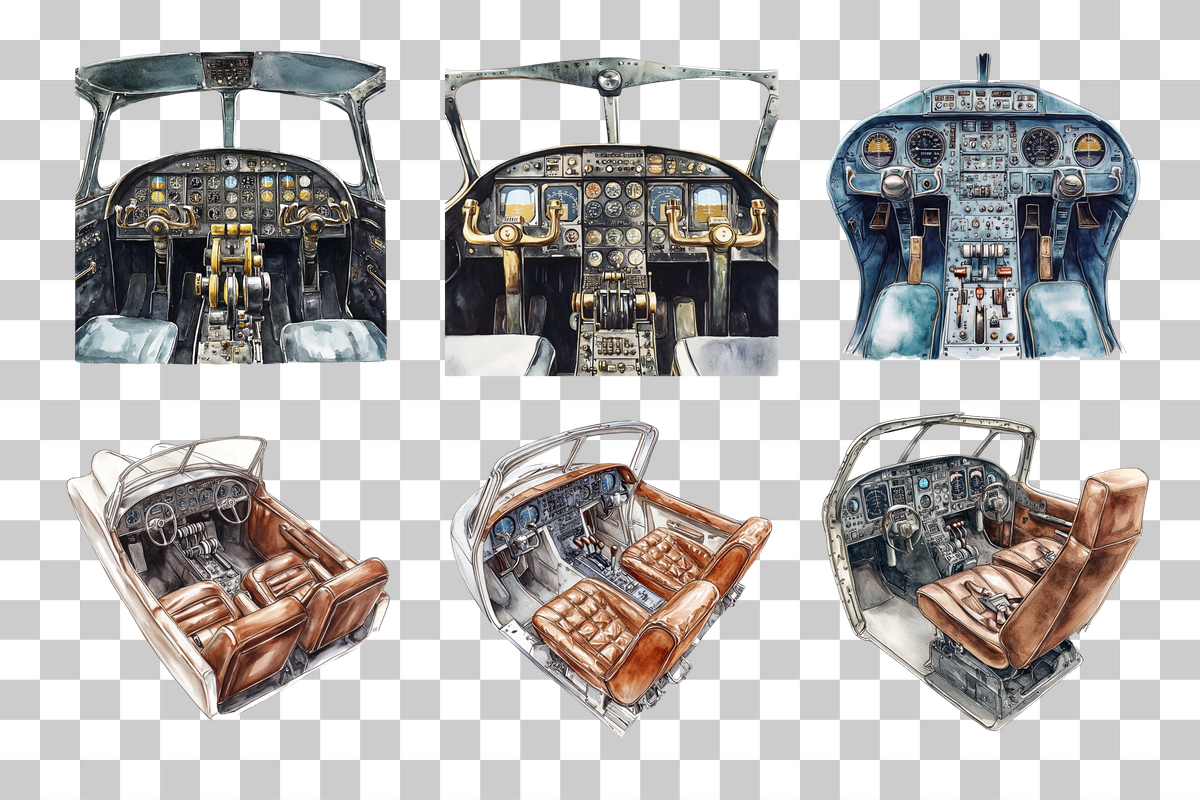 Elevate your creative projects with our Vintage Airplane Cockpit Clipart Bundle, featuring meticulously detailed cockpit designs perfect for aviation enthusiasts and retro-themed crafts. Ideal for digital scrapbooking, educational materials, and unique decor, this collection brings a touch of nostalgia and adventure to your work. Unleash your imagination with these high-quality, versatile images that capture the essence of classic aviation. Perfect for designers, educators, and hobbyists looking to add a vintage flair to their projects.
