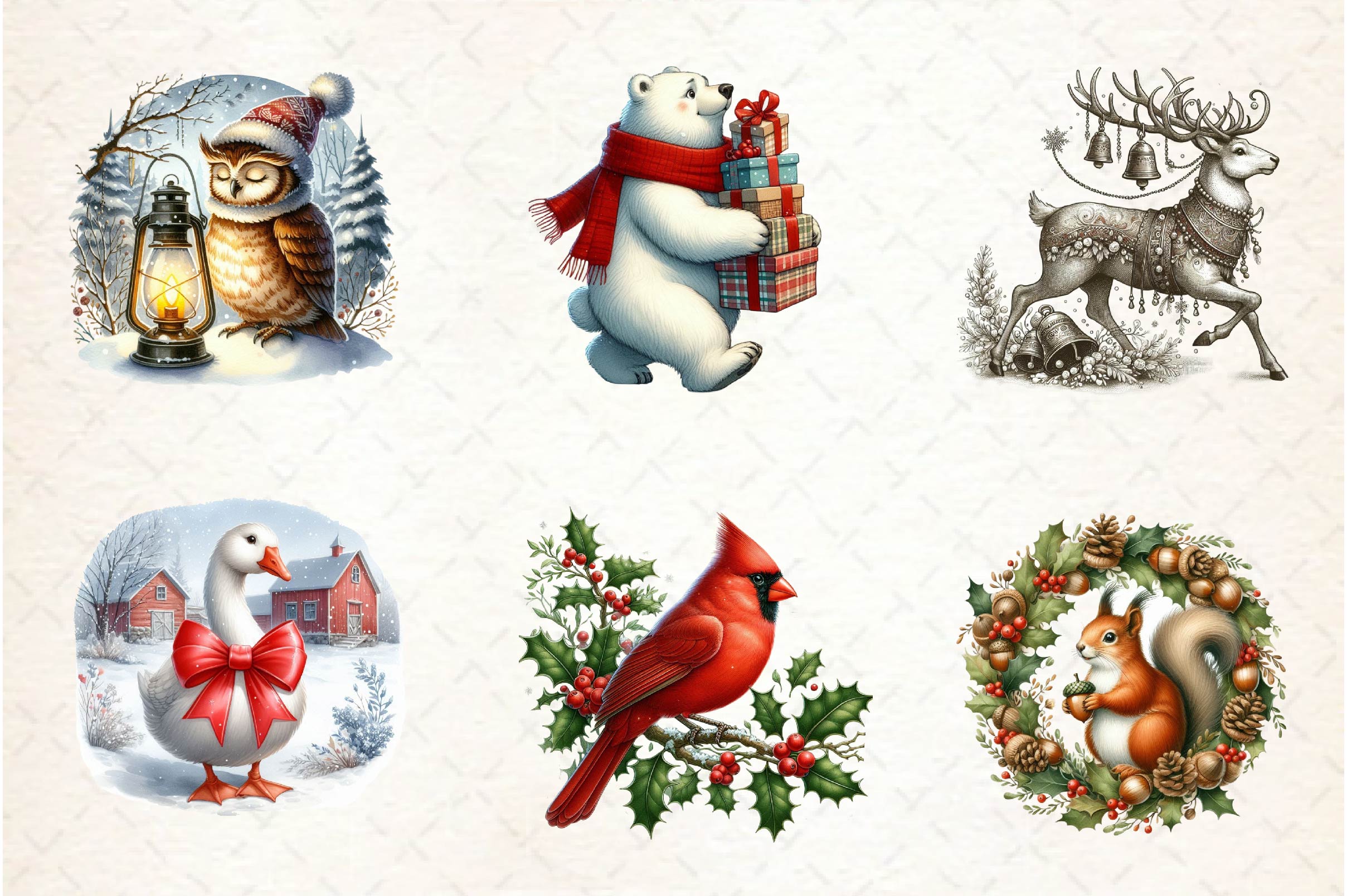 Celebrate with this Vintage Christmas Animals Clipart Bundle, featuring retro holiday designs, ideal for vintage Christmas crafts.