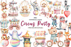 Perform with this Vintage Circus Party Animal Clipart Bundle, featuring retro carnival designs, ideal for vintage animal crafts.