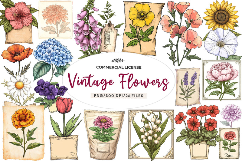 Plant with this Vintage Flowers Seed Packet Clipart Bundle, featuring retro garden designs, perfect for vintage gardening crafts.