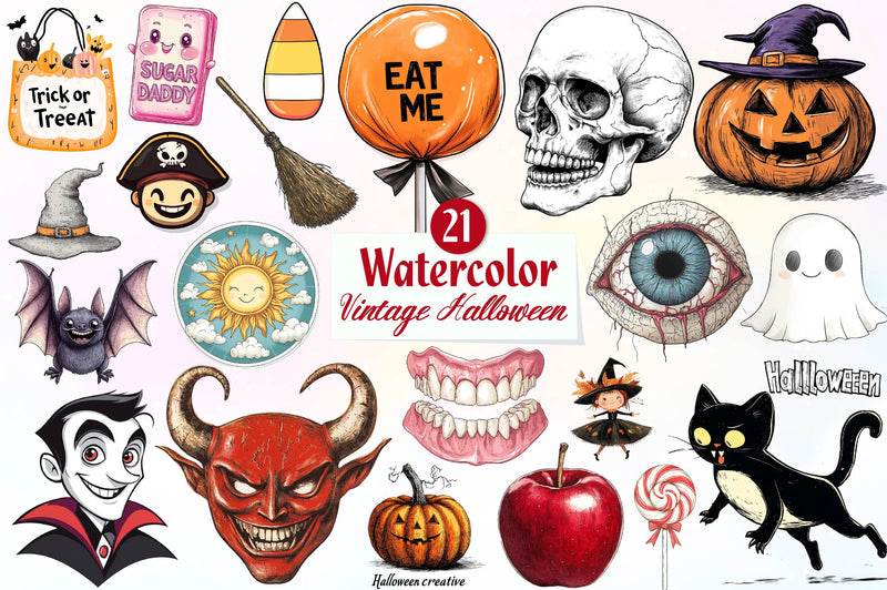 Haunt with this Vintage Halloween Clipart Bundle, featuring retro spooky designs, perfect for classic Halloween crafts.