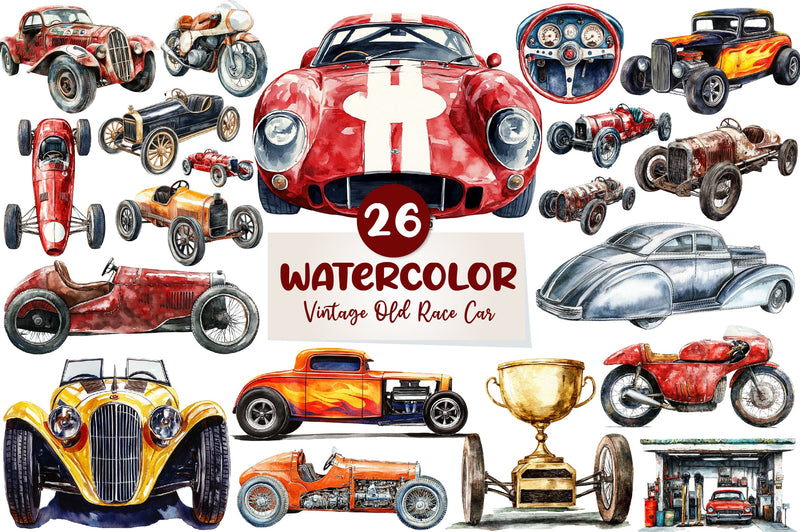 Race with this Vintage Old Race Car Clipart Bundle, featuring vintage race cars, perfect for retro vehicle crafts.