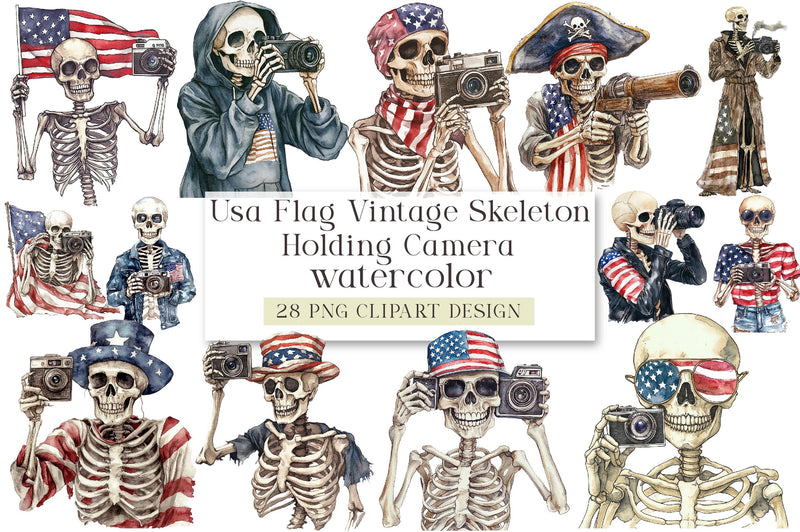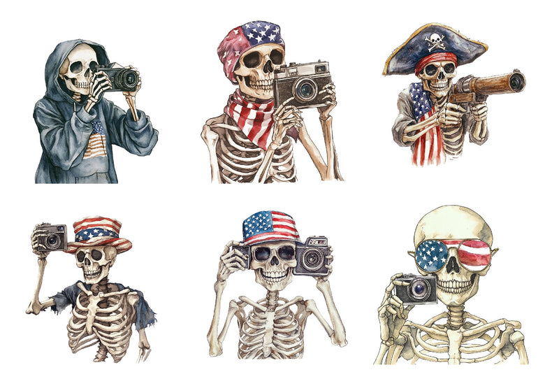 Vintage Skeleton Holding Camera Clipart Bundle - USA Flag Theme