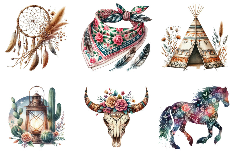 Unleash your creativity with our Western Boho Clipart Bundle, featuring a stunning collection of bohemian-inspired designs perfect for crafting, scrapbooking, and digital projects. Dive into a world of rustic charm with unique elements like dreamcatchers, feathers, and wildflowers, ideal for adding a touch of boho elegance to your creations. Perfect for designers, artists, and DIY enthusiasts looking to infuse their work with a free-spirited, Western vibe. Transform your projects with this versatile clipart set, designed to inspire and captivate.