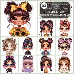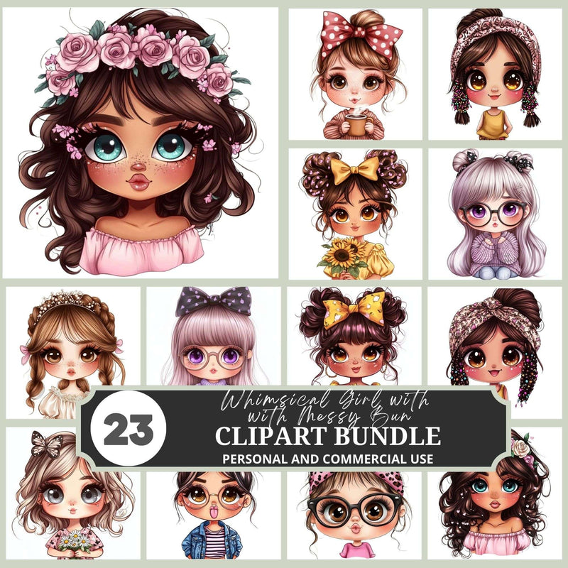 Dream free with this Whimsical Girl with Messy Bun Clipart set, featuring playful designs, ideal for quirky crafts.