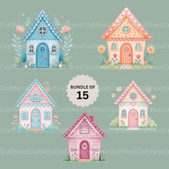 Dwell with this Whimsical Houses 15 Clipart Bundle, featuring magical house designs, perfect for fairytale enchanted crafts.