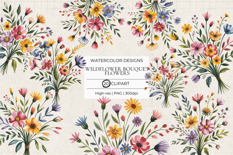 Enhance your creative projects with our Wildflower Bouquet Flowers Clipart, featuring vibrant and delicate floral designs perfect for wedding invitations, scrapbooking, and digital art. These high-resolution images bring a touch of nature's elegance to any craft, making them ideal for DIY enthusiasts and professional designers alike. Transform your creations with the timeless beauty of wildflowers, and let your imagination blossom.