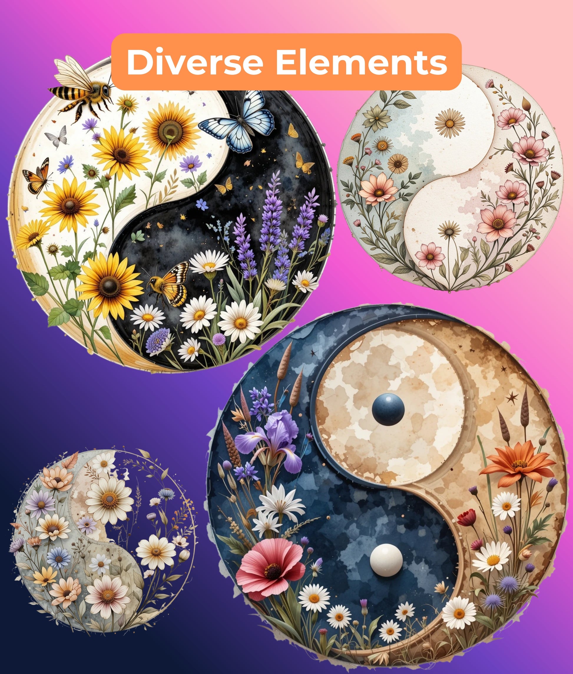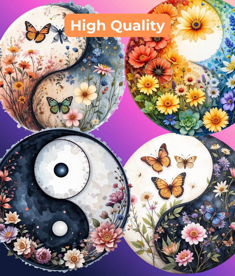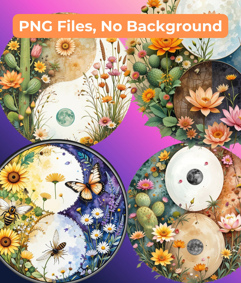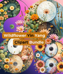 Enhance your creative projects with the Wildflower Yin Yang Clipart Bundle, featuring a harmonious blend of nature-inspired designs. Perfect for digital scrapbooking, invitations, and artistic crafts, this collection brings a touch of balance and beauty to your work. Ideal for nature lovers and creative enthusiasts, these unique illustrations will elevate your designs with their intricate details and vibrant colors. Unleash your creativity and transform your projects with this captivating clipart set.