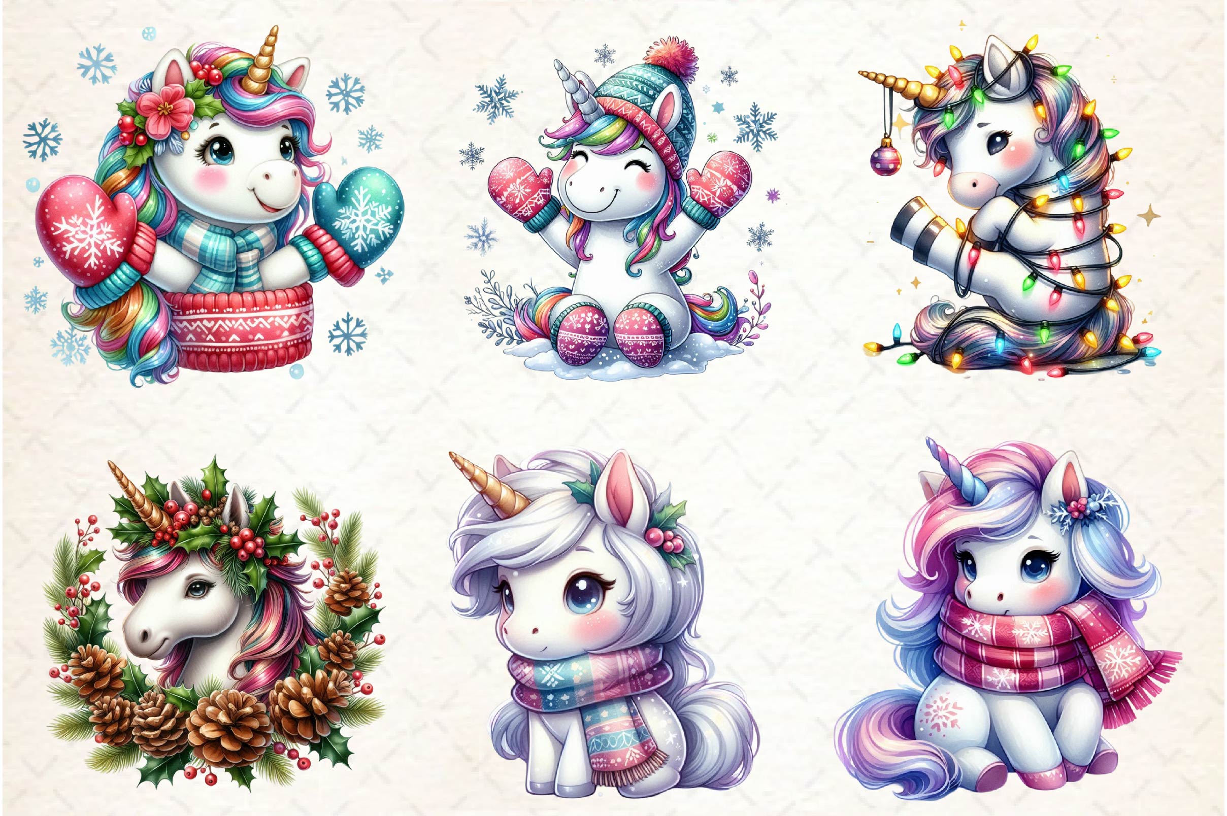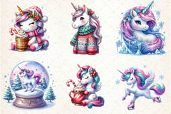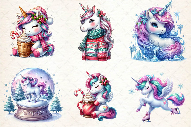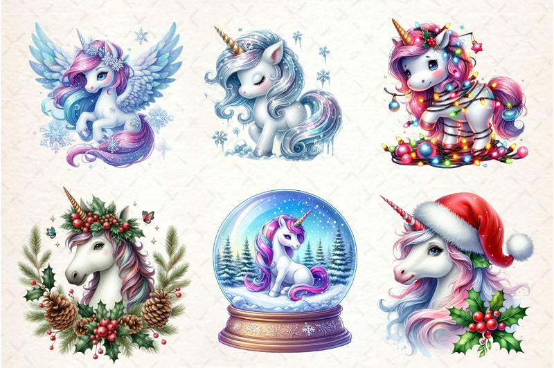 Sparkle with this Winter Unicorn Clipart Bundle, featuring magical winter unicorn designs, ideal for fantasy crafts.