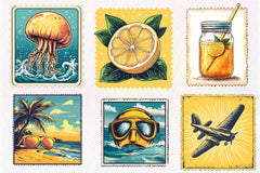 Mail with this Yellow Summer Postage Stamps Clipart Bundle, featuring postal summer designs, perfect for summer travel crafts.